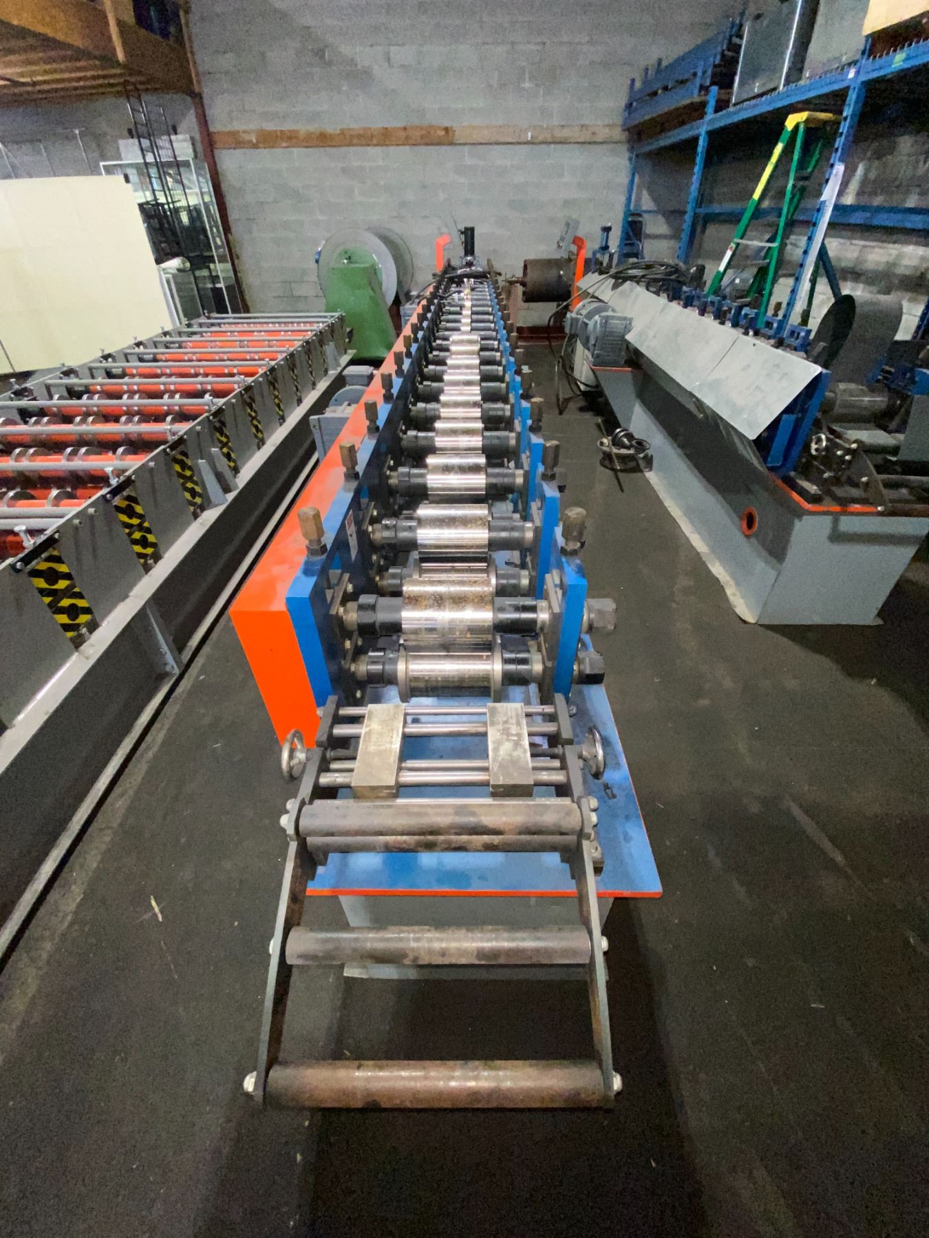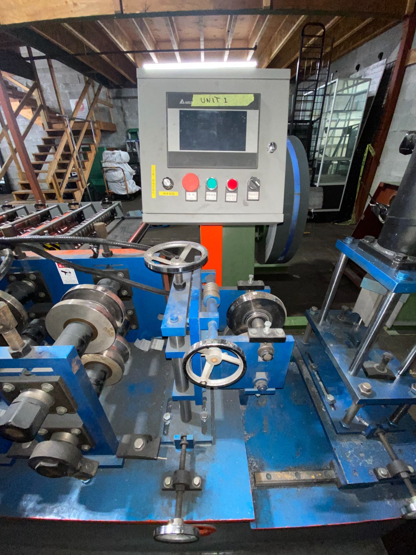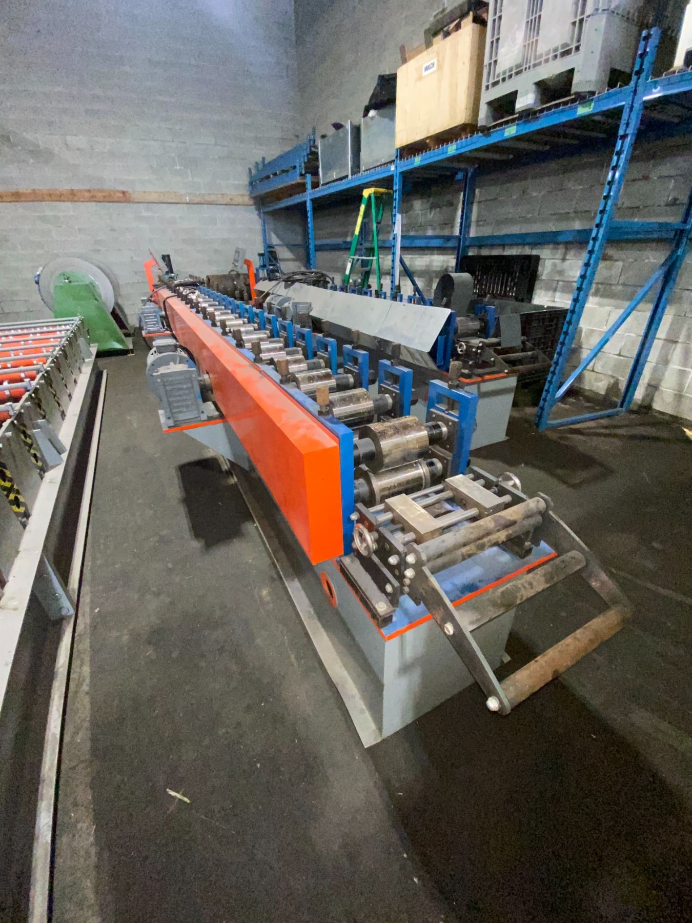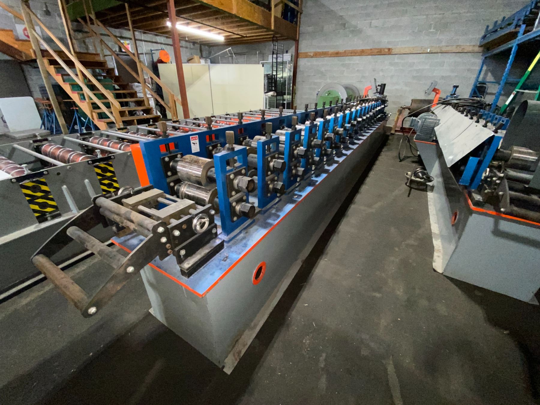 BOTOU KENXINDA BLUE/ORANGE KEEL ROLL FORMING MACHINE APPROX 24'L X 5'H X 3.5'W WITH HYDRAULIC POWER UNIT 3.3'H X 2.3'W X 2'D *REQUIRES HIAB/CRANE & HEAVY SKATES FOR REMOVAL*