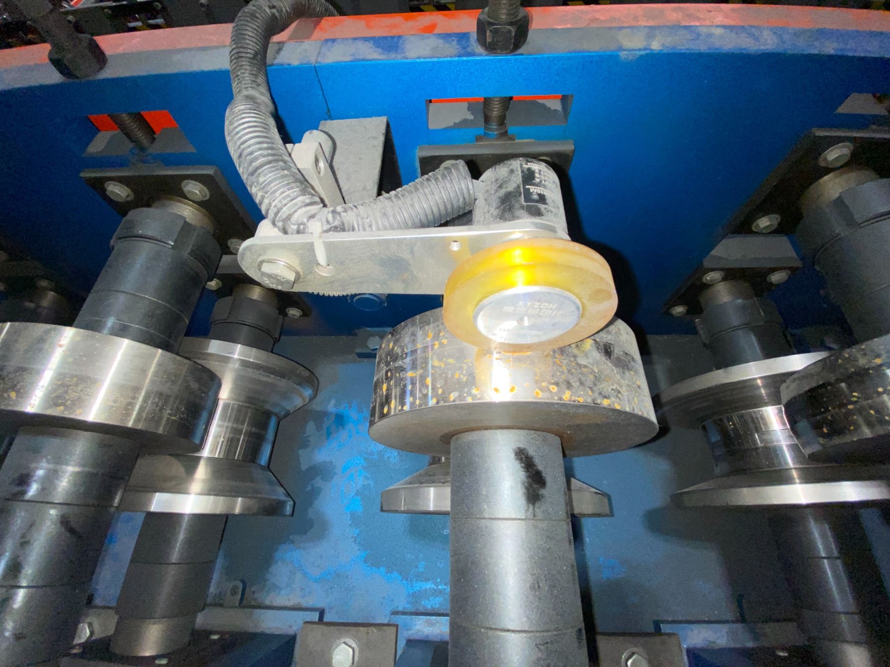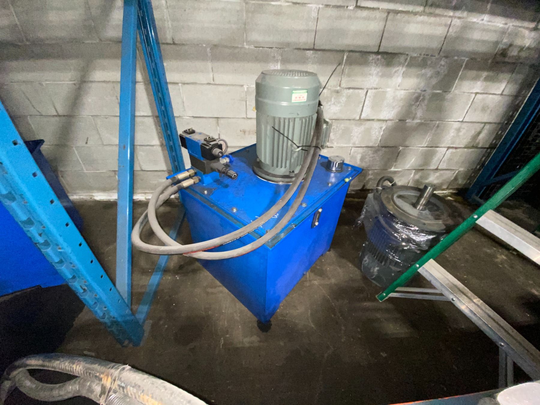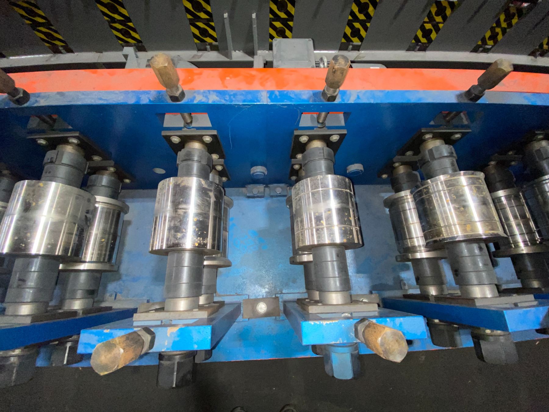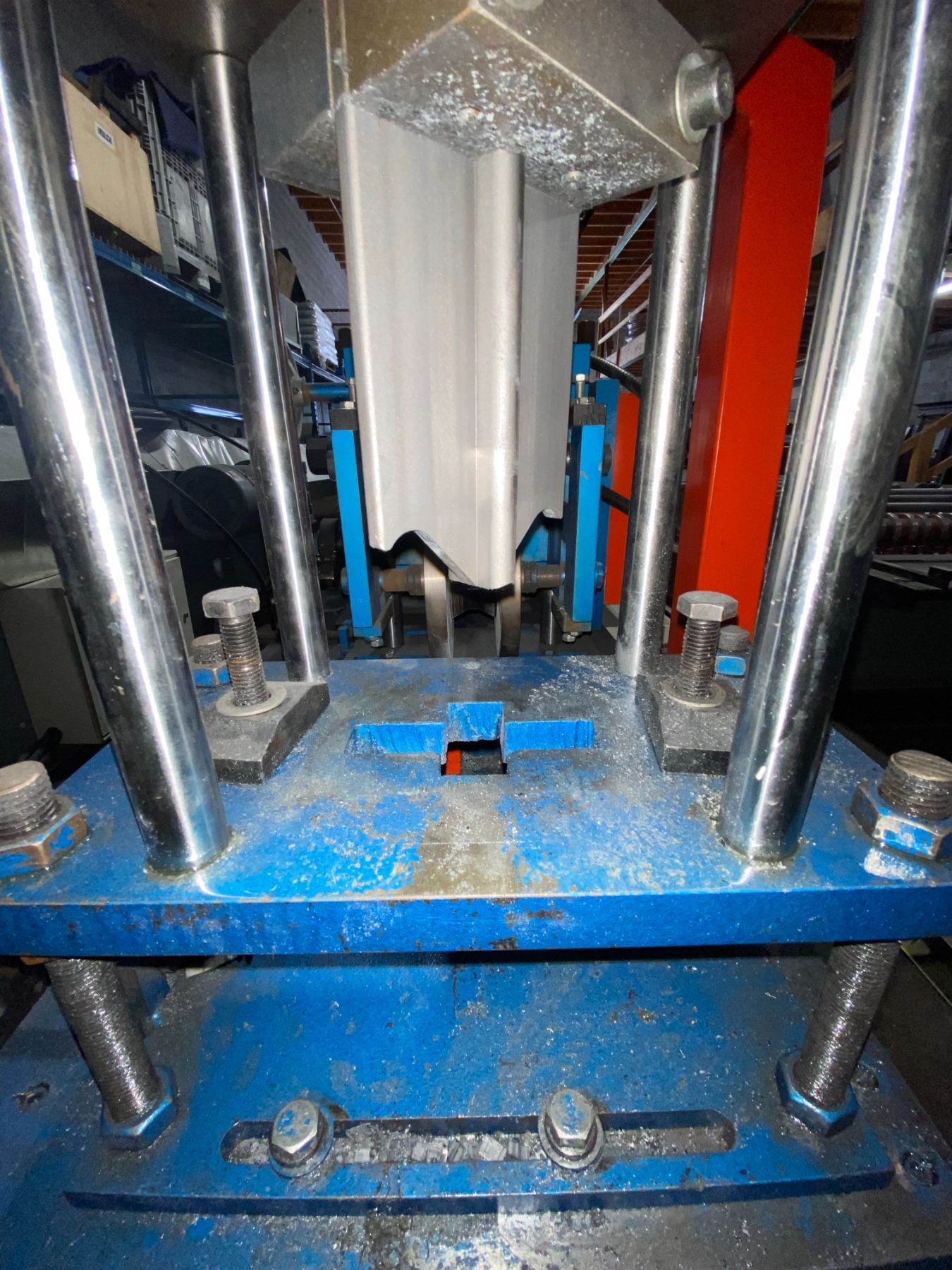 BOTOU KENXINDA BLUE/ORANGE KEEL ROLL FORMING MACHINE APPROX 24'L X 5'H X 3.5'W WITH HYDRAULIC POWER UNIT 3.3'H X 2.3'W X 2'D *REQUIRES HIAB/CRANE & HEAVY SKATES FOR REMOVAL*