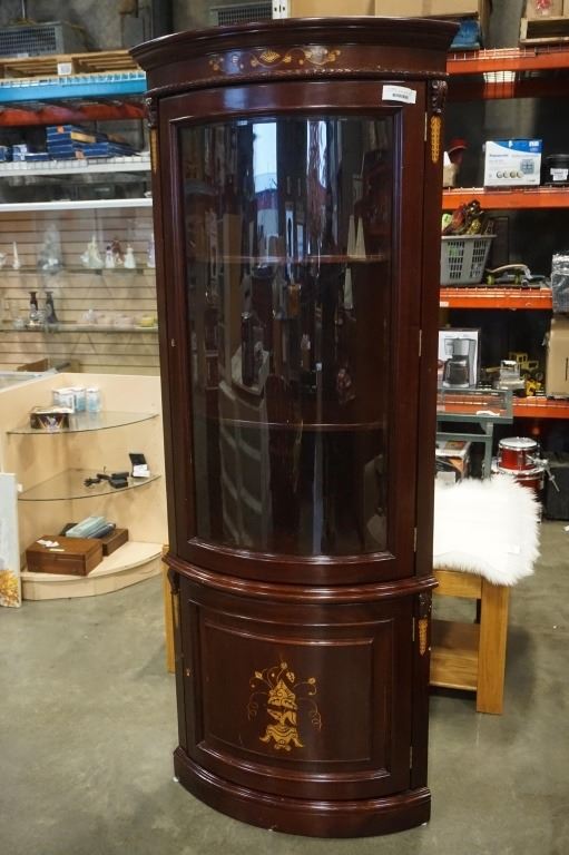 BOWED GLASS CORNER CABINET - NO KEY, SKELETON KEY REQUIRED