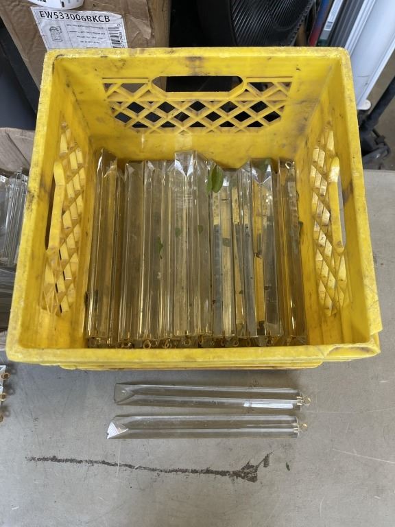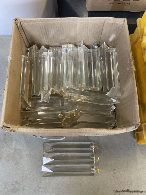BOX AND CRATE OF CRYSTAL PENDANTS