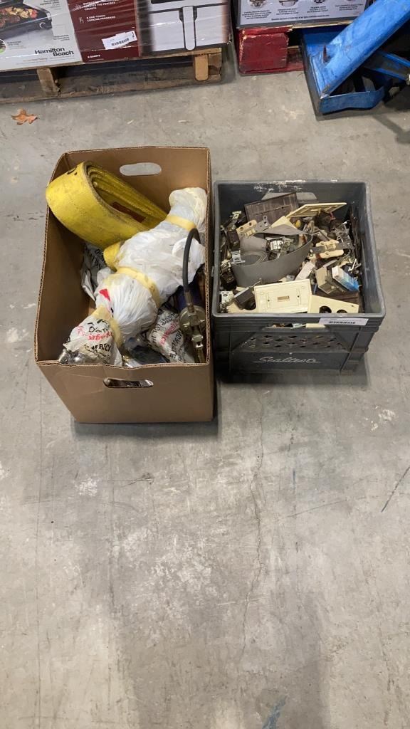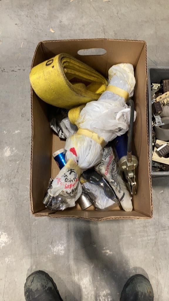 BOX AND CRATE OF GREASE GUNS, LIFTING STRAPS, ELECTRICAL AND MORE