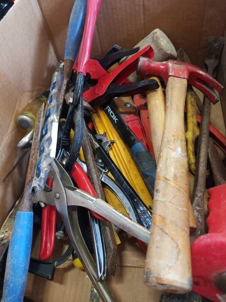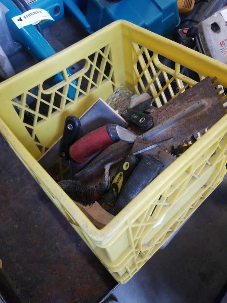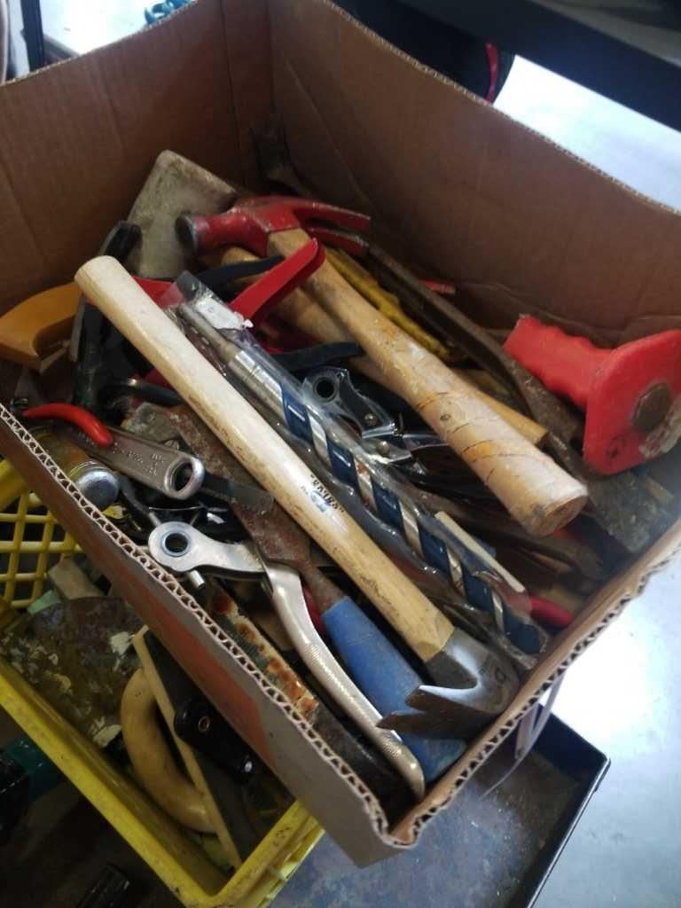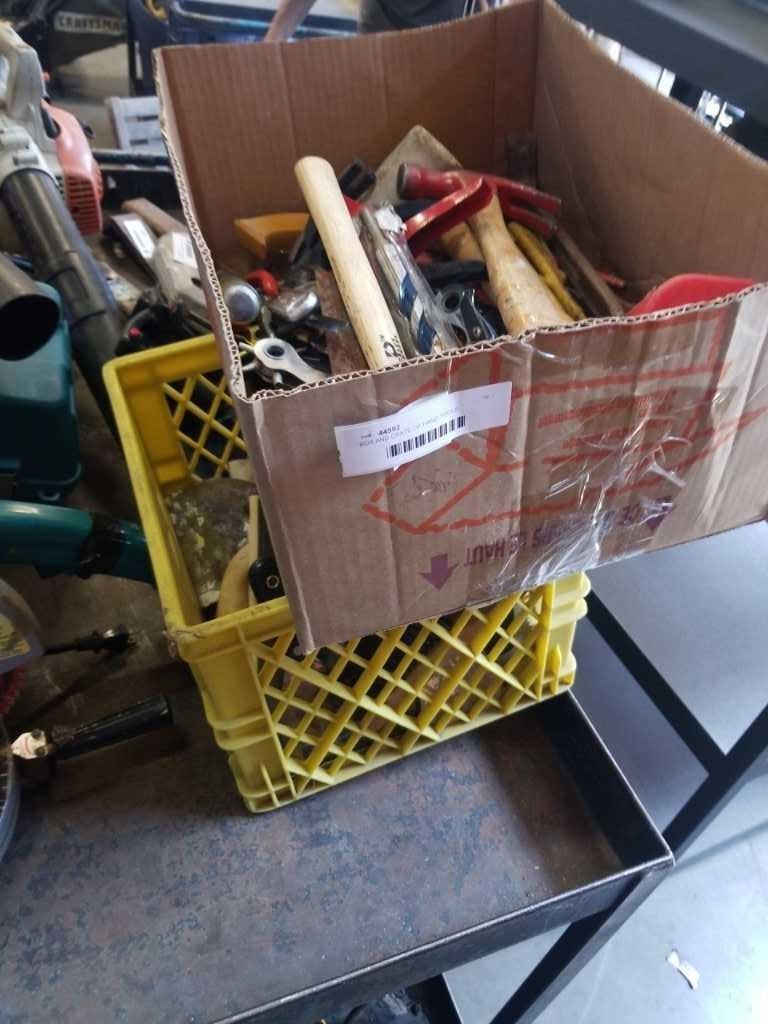 BOX AND CRATE OF HAND TOOLS, HAMMERS, SANDERS, DRYWALL TOOLS