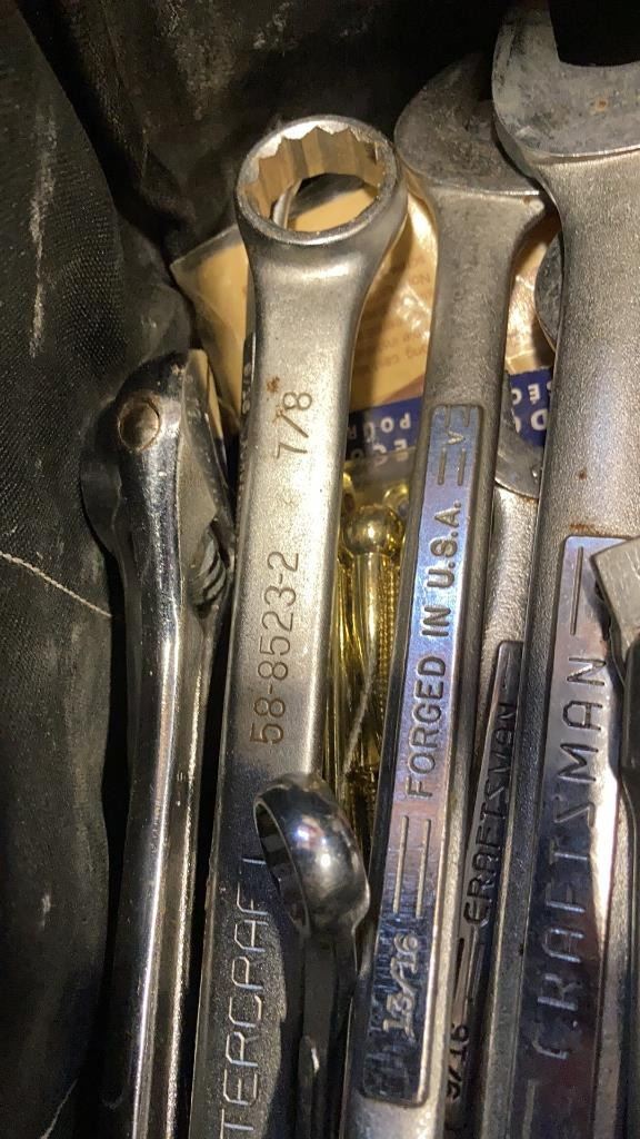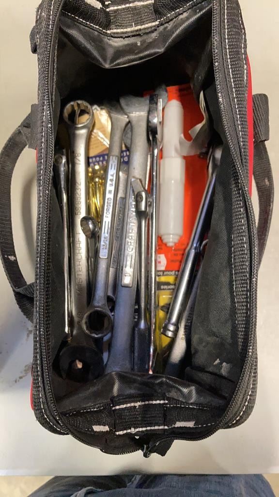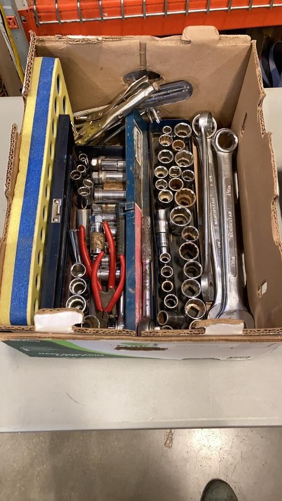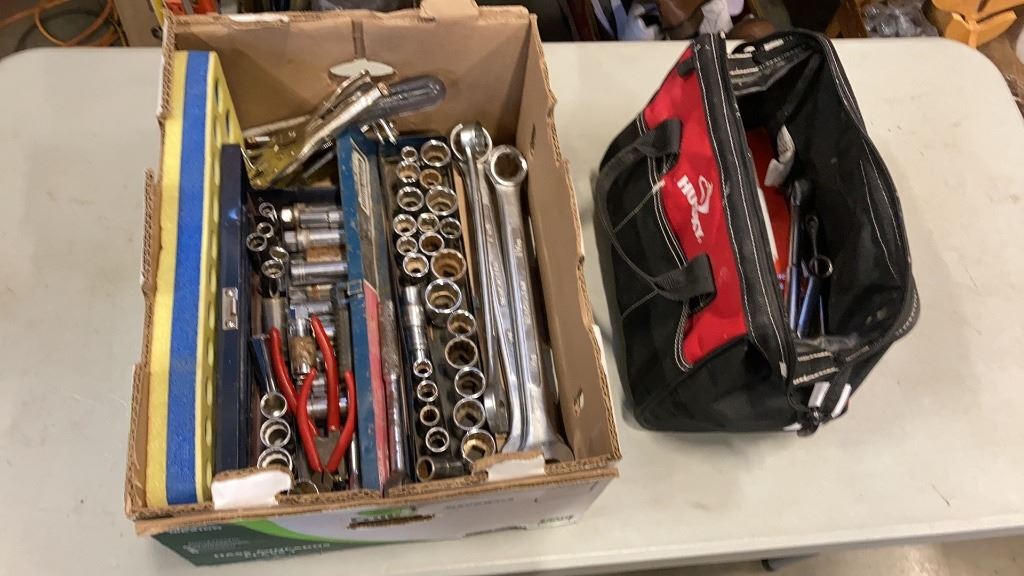BOX AND HUSKY BAG OF WRENCHES AND SOCKETS