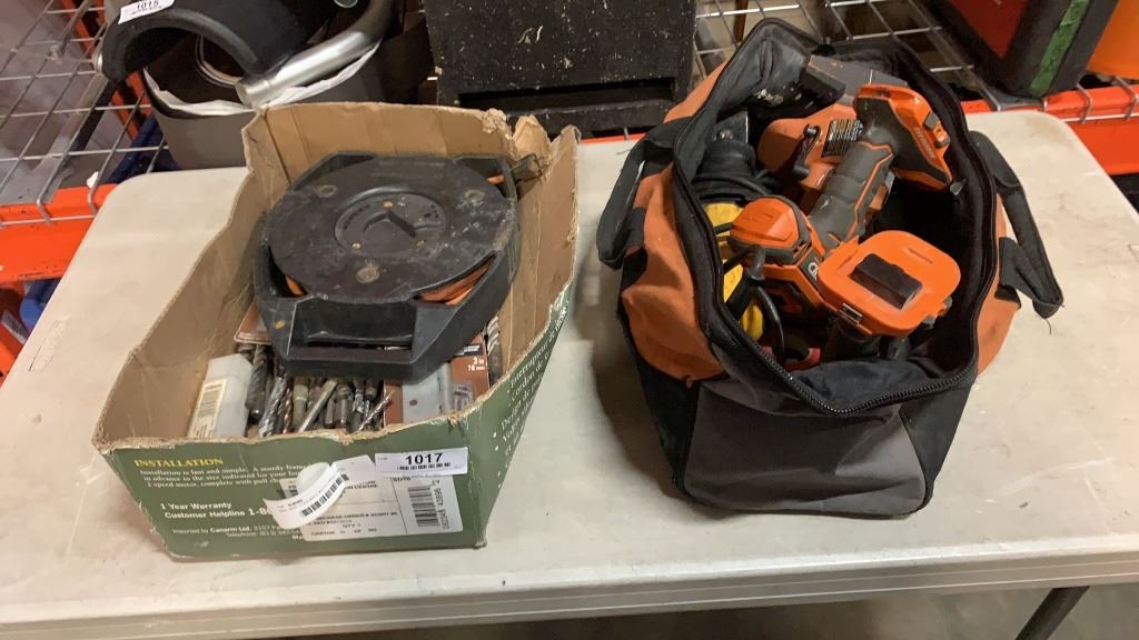 BOX AND TOOLBAG WITH DRILL BITS, EXTENTION CORD REEL, DEWALT SAWZALL, RYOBI CORDLESS TOOLS