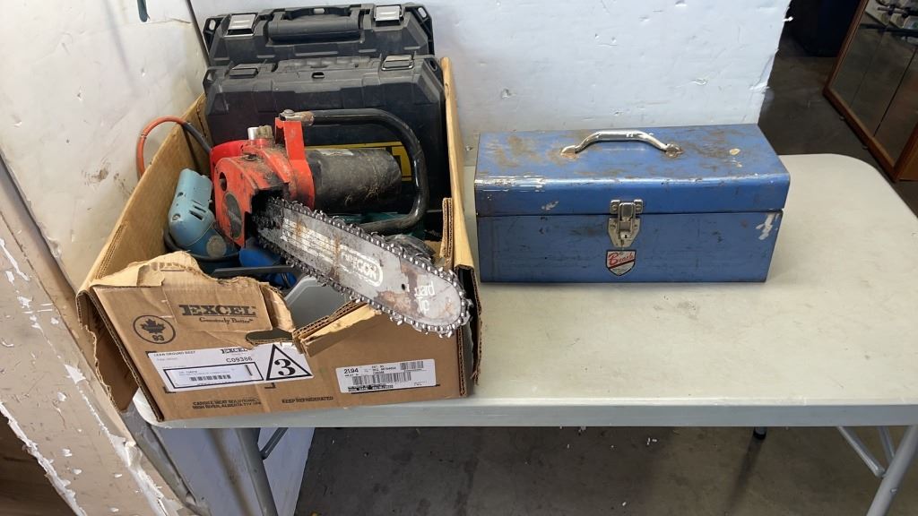 BOX AND TOOLBOX OF POWER TOOLS, CORDLESS BATTERIES CHARGERS AND MORE