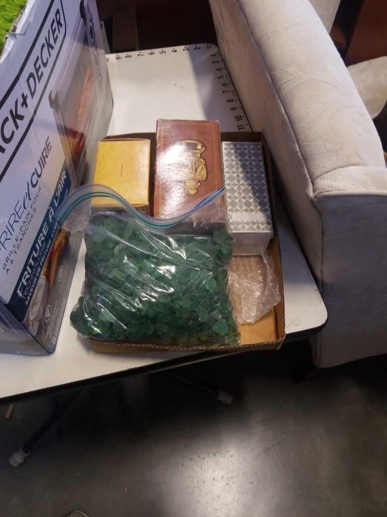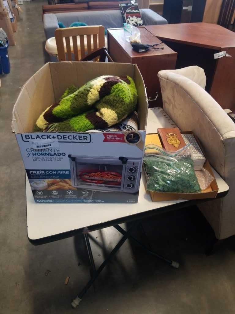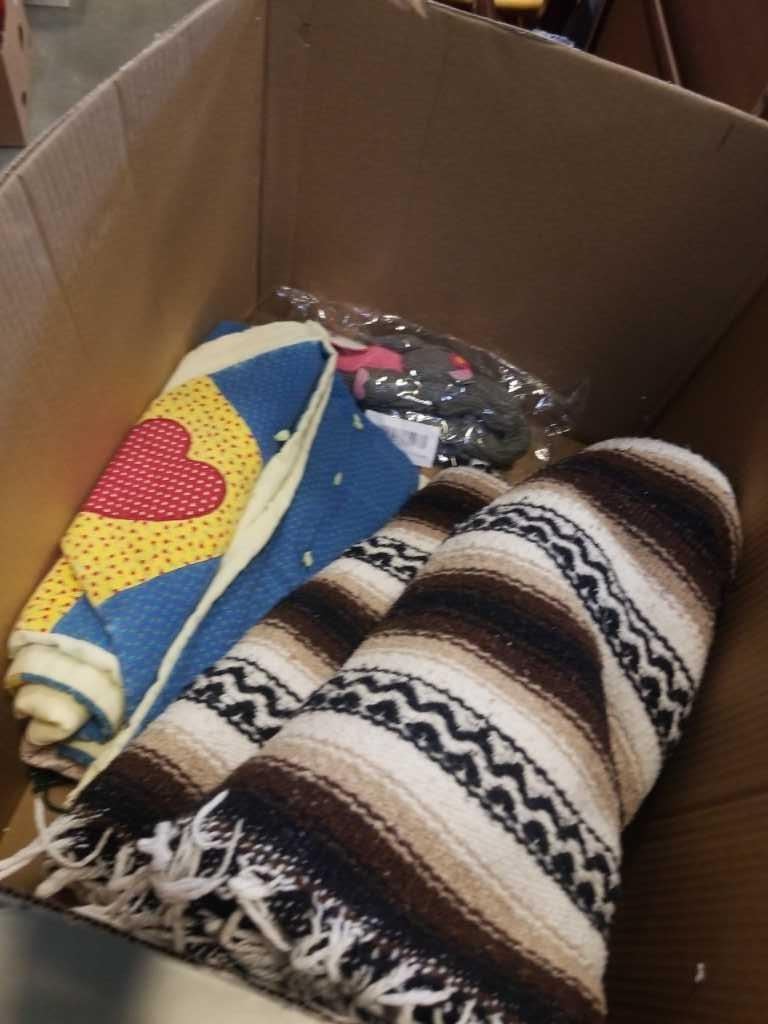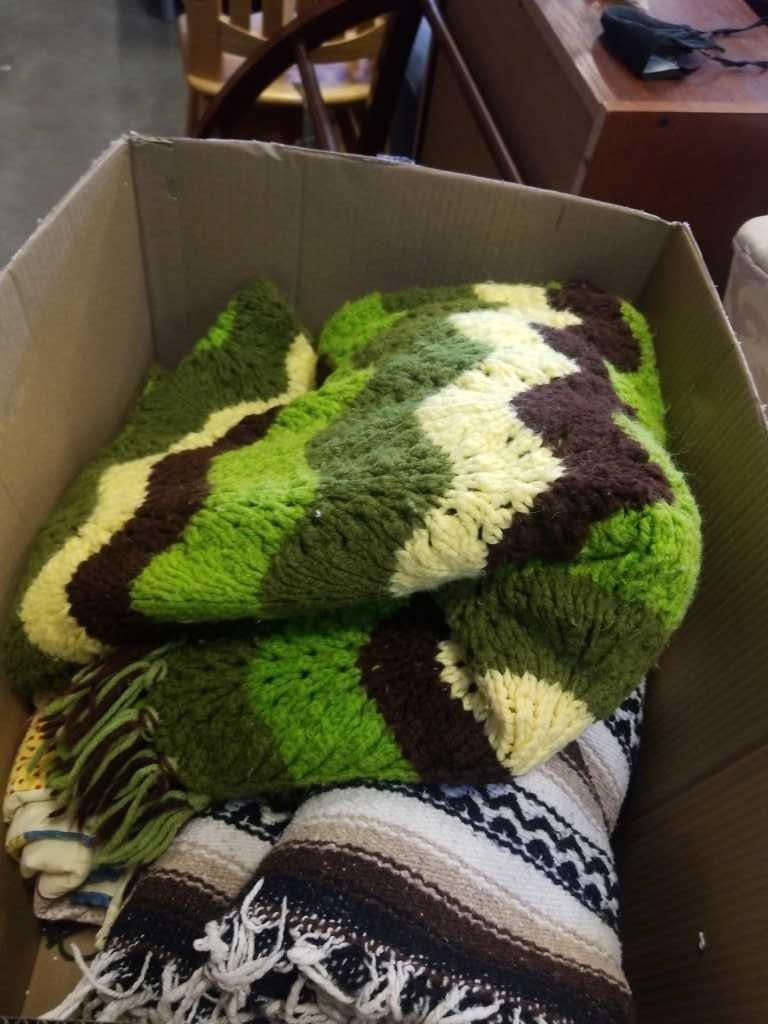 BOX AND TRAY OF AVON COLLECTABLES AND WOVEN BLANKETS