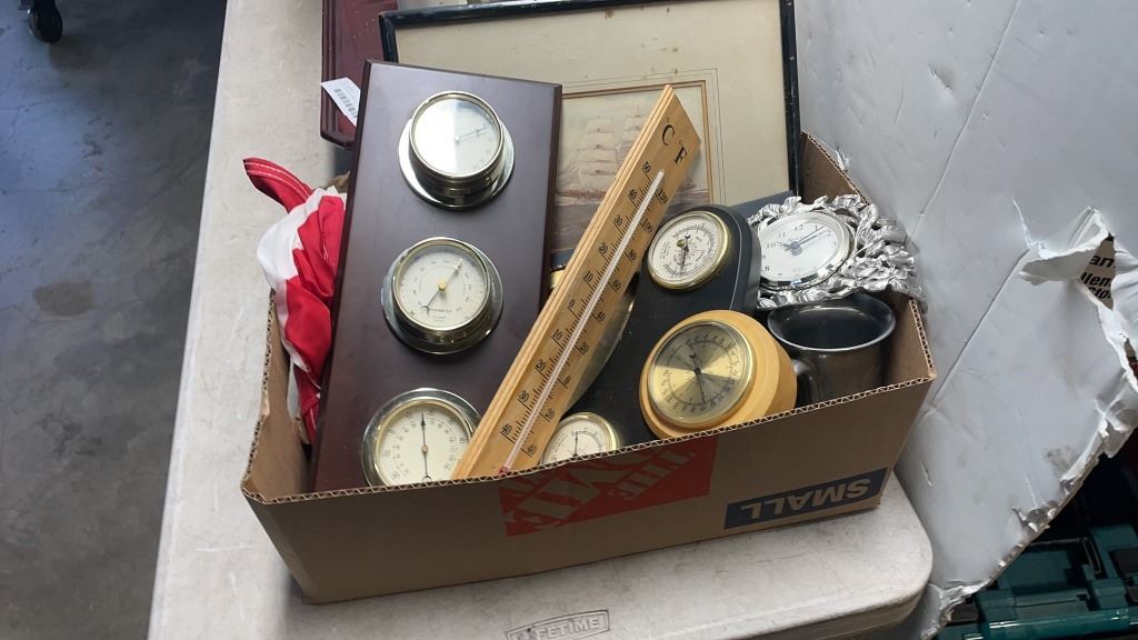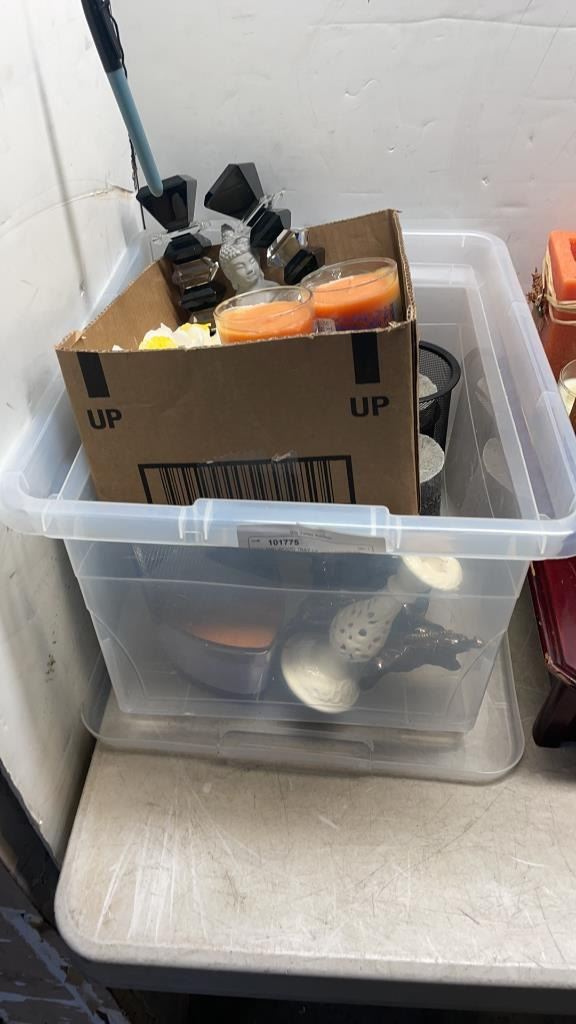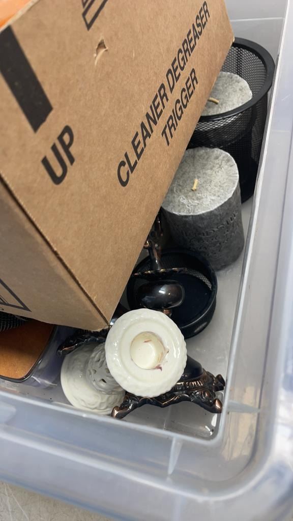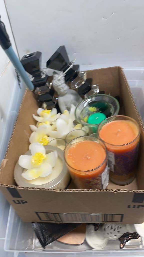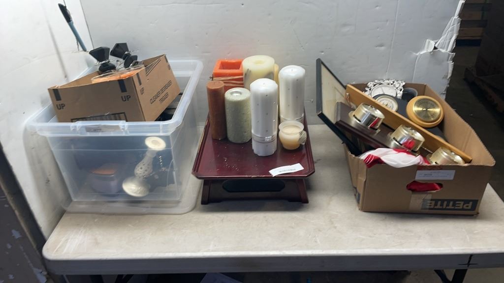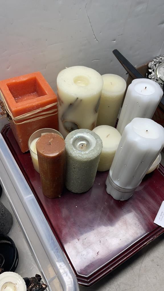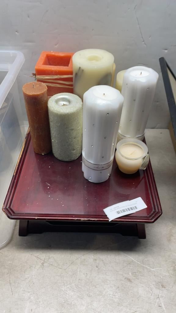 BOX AND WOOD TRAY OF COLLECTIBLES AND CANDLES