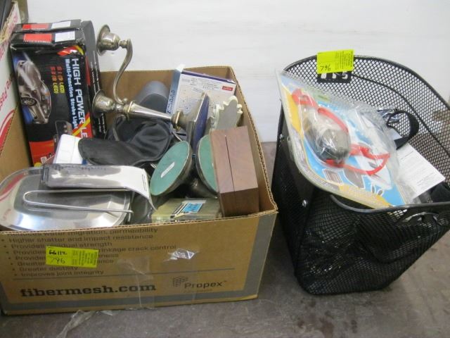 BOX & BASKET OF MISC. SILVER CANDLEHOLDERS, LED LIGHTS, CLAMPS, ETC.