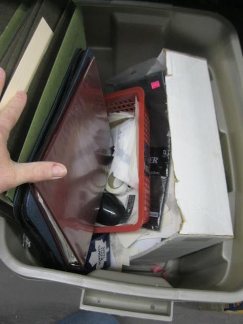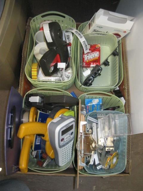 BOX & BIN OF MISC. PRICE GUNS, LABELLER, FILES, ETC.