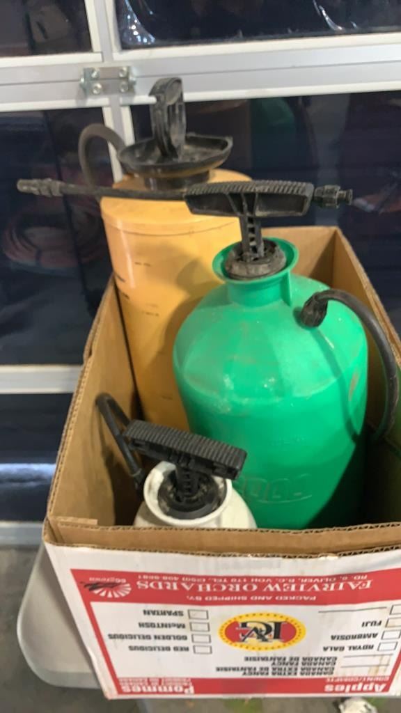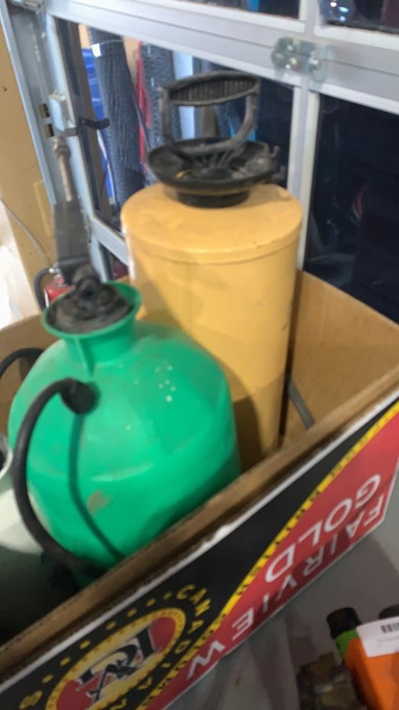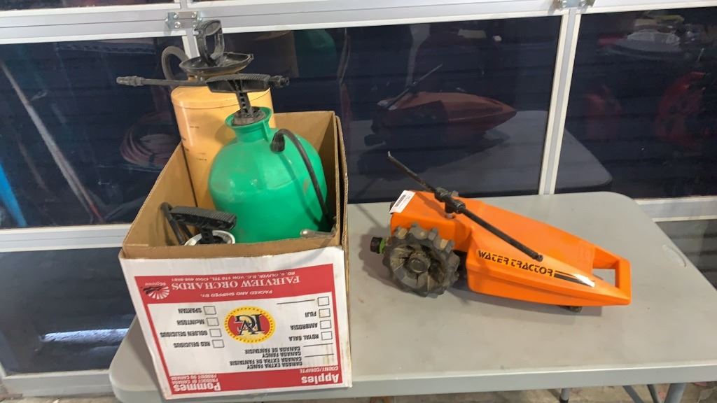BOX OF 3 SPRAYERS AND LAWN TRACTOR SPRINKLER