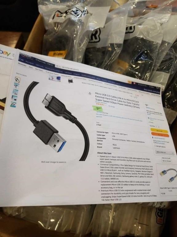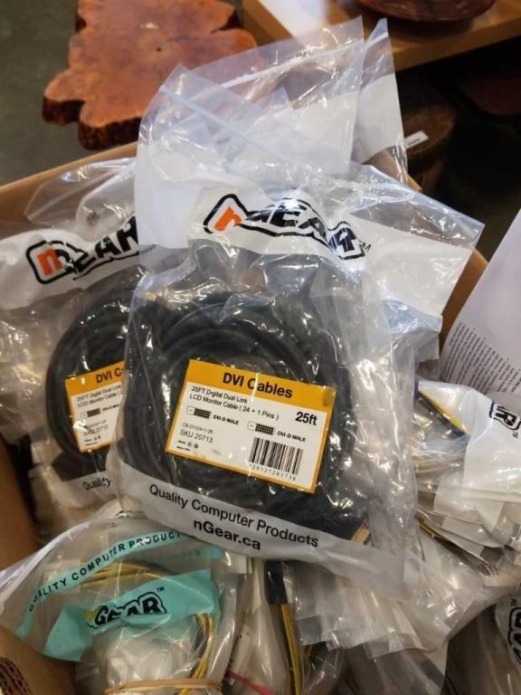 BOX OF 8 NEW DVI 4K VIDEO CABLES, 100 PIECES MICRO USB 3.0 EXTERNAL HD CORDS, AND 150 PIECES 4-8 PIN