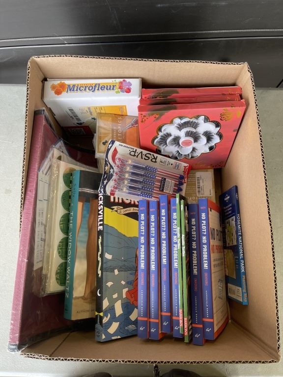 BOX OF AMAZON ITEMS - BOOKS, NEW EYE LASH KITS, MICROWAVE FLOWER CRAFT, ETC