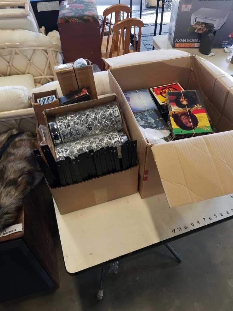 BOX OF AMAZON OVERSTOCK ITEMS AND BOX OF CDS