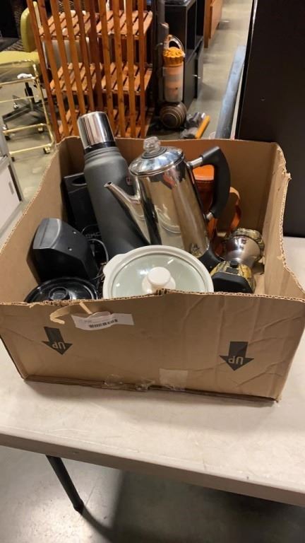 BOX OF APPLIANCES, BINOCULARS, STANLEY THERMOS