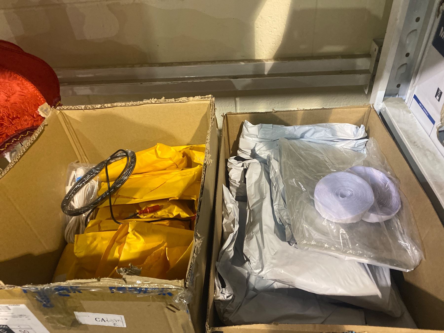 BOX OF ASSORTED AUDIO CABLE AND CHARGERS AND BOX OF PLASTIC SHEETING