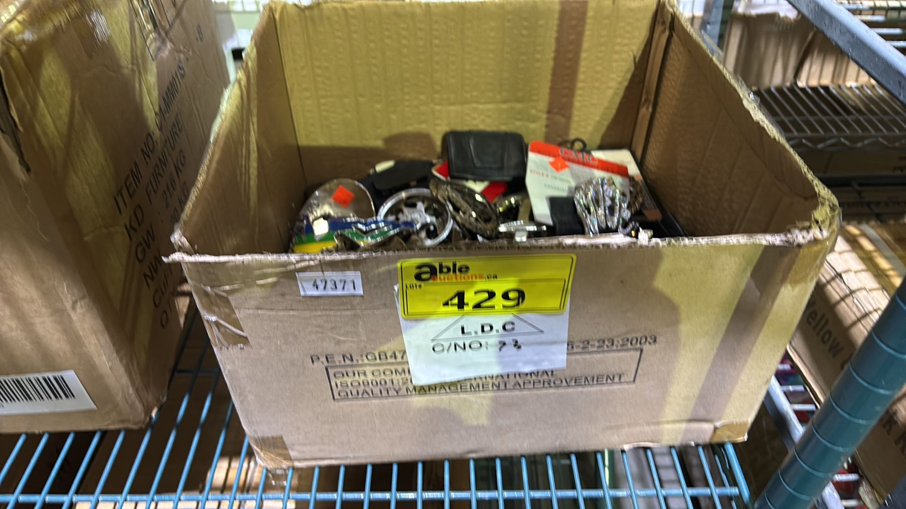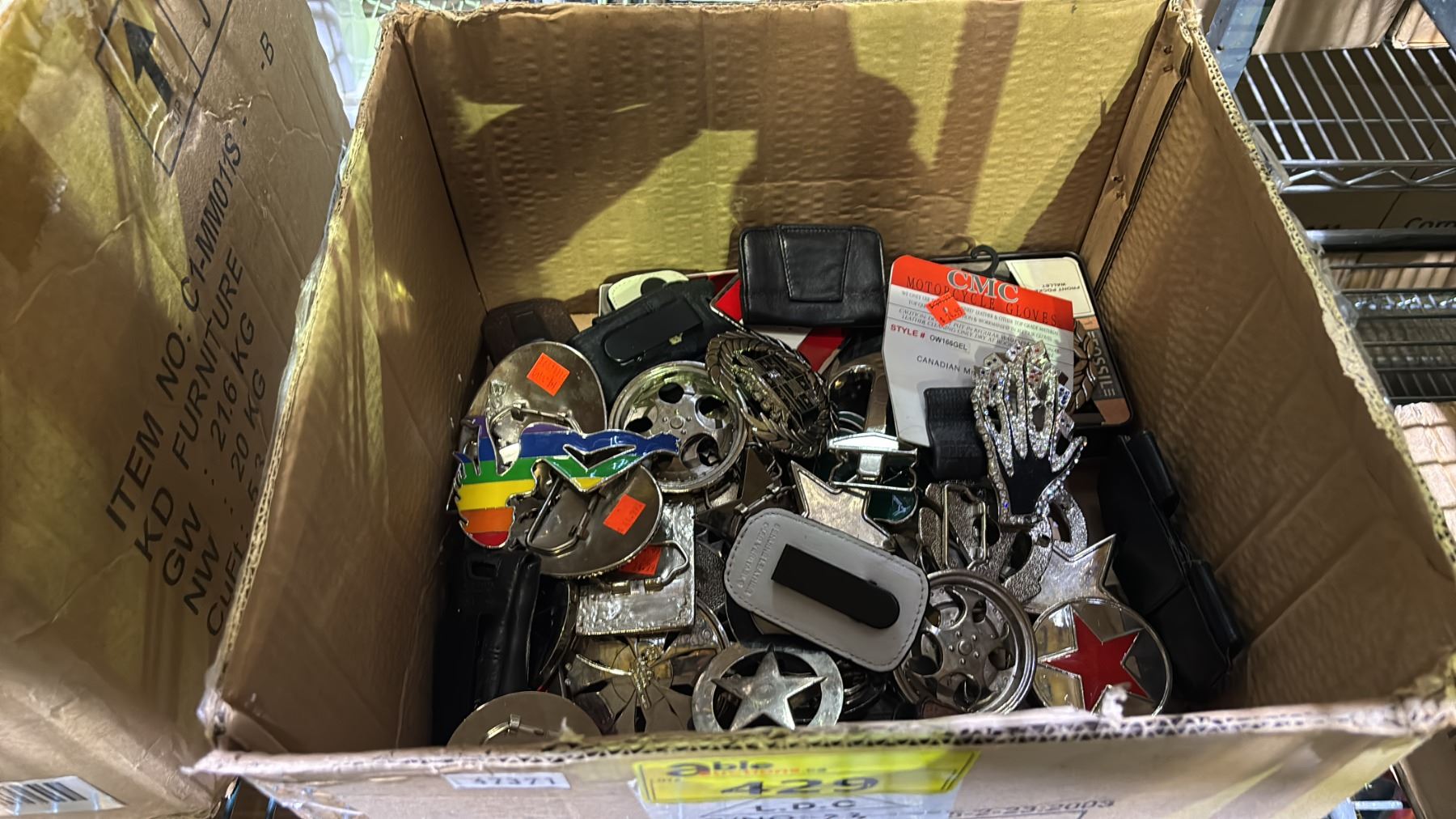 BOX OF ASSORTED BELT BUCKLES & BELT HOLSTERS