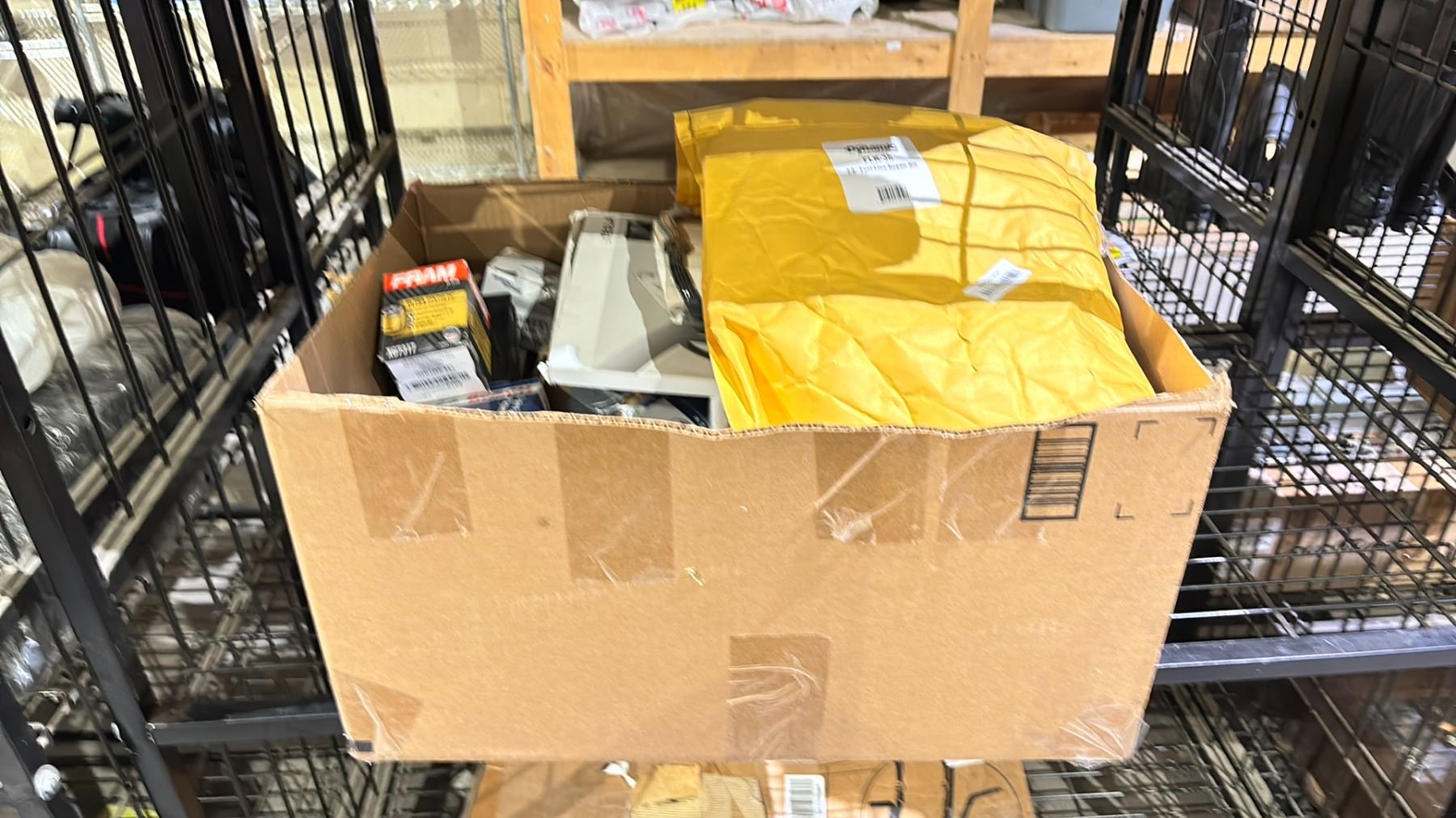BOX OF ASSORTED BOSCH BRAKE PADS, FRAM OIL FILTER, BOSCH REAR WINDSHIELD WIPER AND MORE