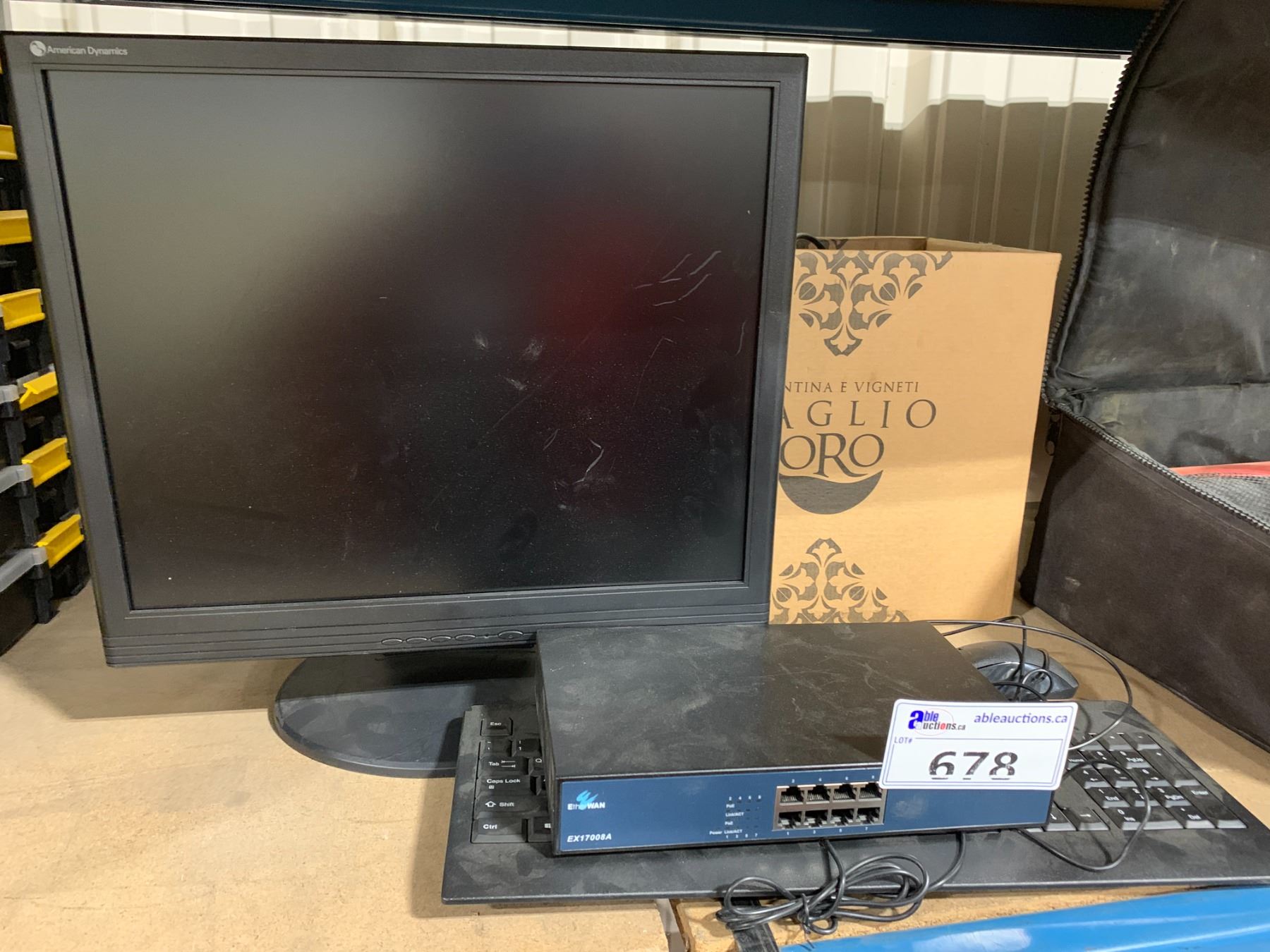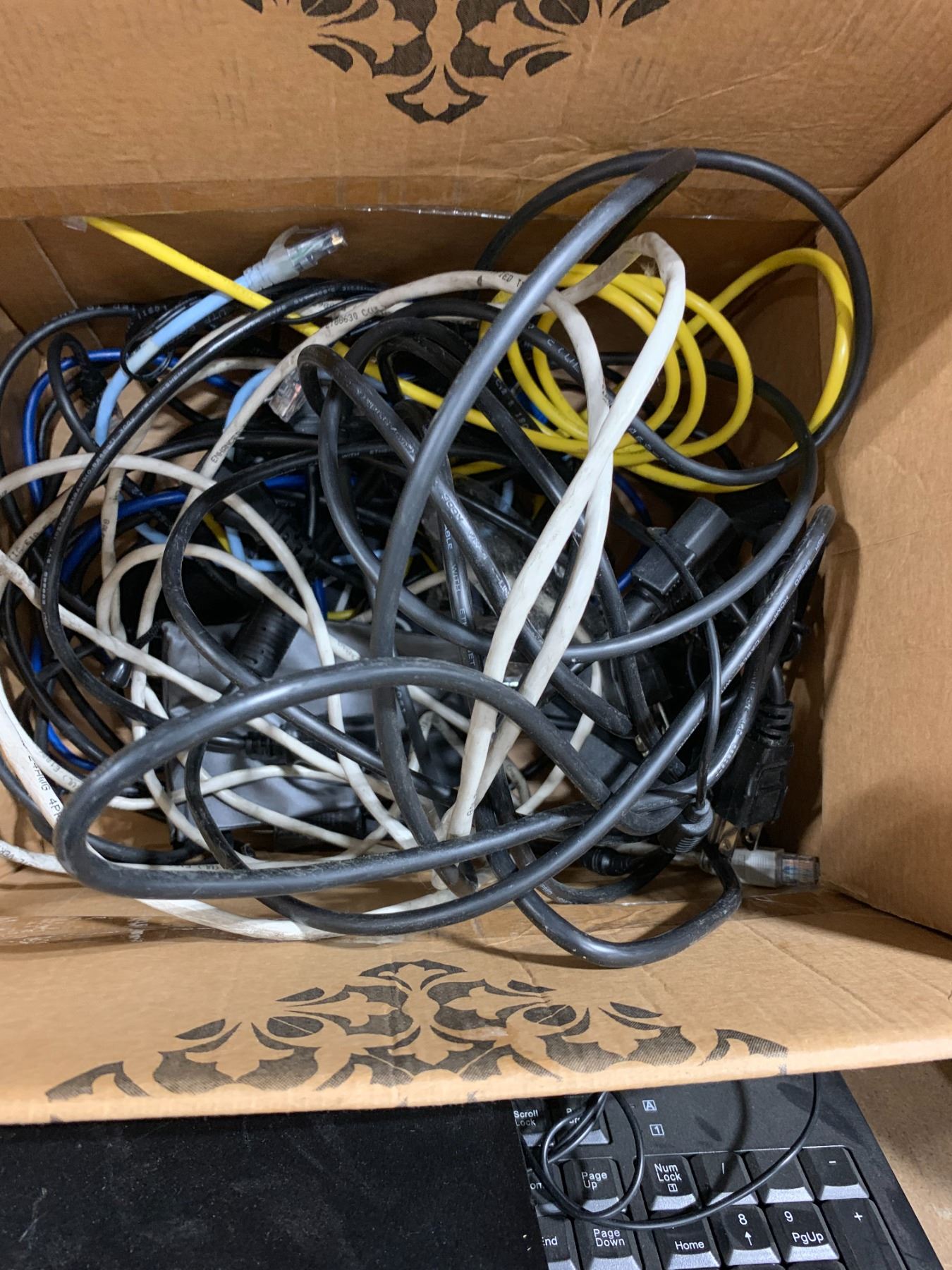 BOX OF ASSORTED CABLES, COMPUTER MONITOR, ETHERNET PORT, KEYBOARD & MORE