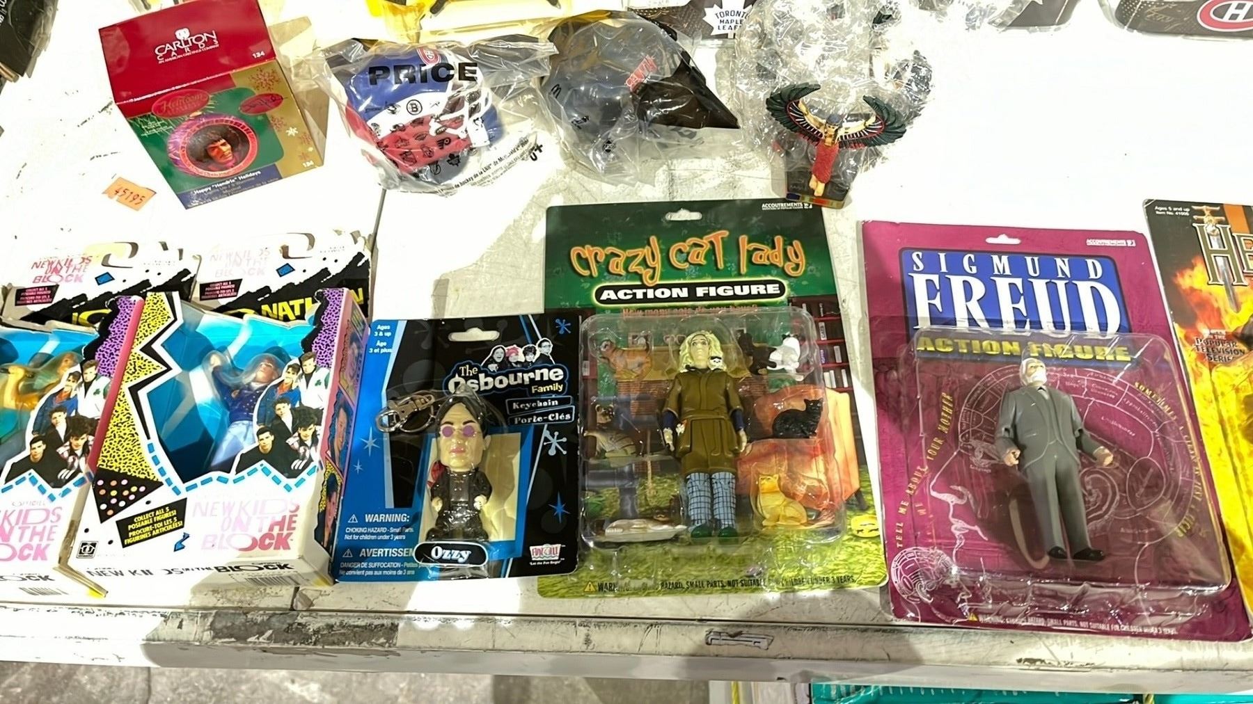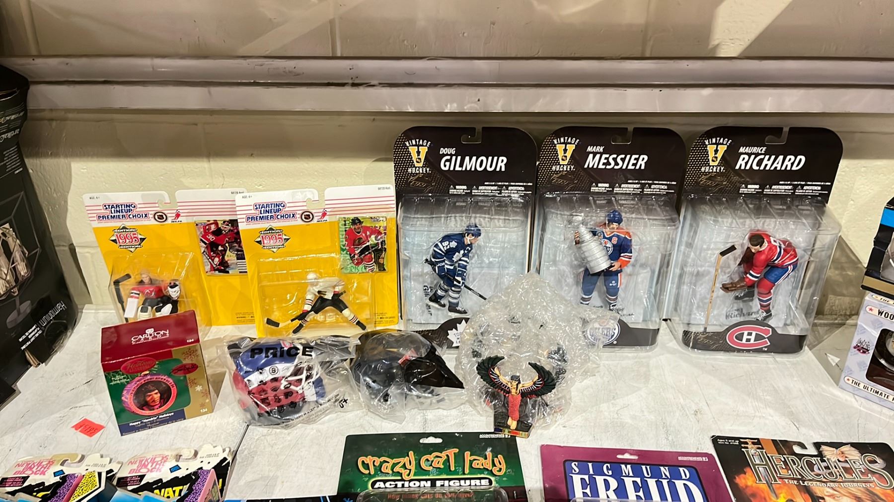 BOX OF ASSORTED COLLECTIBLES INCLUDING; MAURICE RICHARD FIGURE, HERCULESE THE LEGENDARY JOURNEYS FIGURES, OZZY OSBOURNE FIGURE & MORE