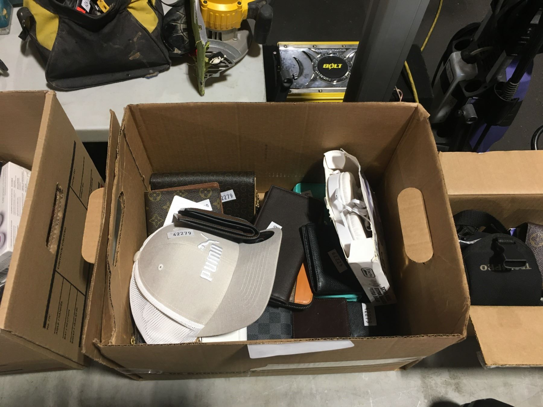 BOX OF ASSORTED DESIGNER WALLETS, CLUTCHES, HAT AND PAIR OF STEREO HEADPHONES
