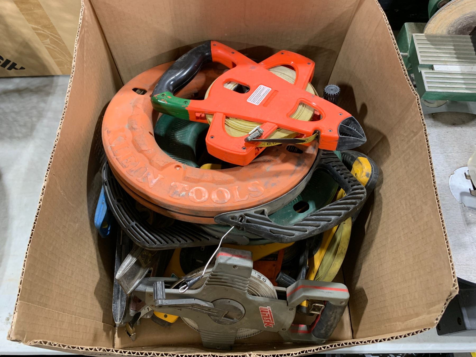 BOX OF ASSORTED FIBERGLASS TAPE MEASURES, DEPTH FINDER FISH TAPES, BEAM LEVELS & MORE