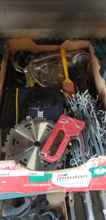 BOX OF ASSORTED HARDWARE, TOOLS, PEGS, SAW BLADE, ETC