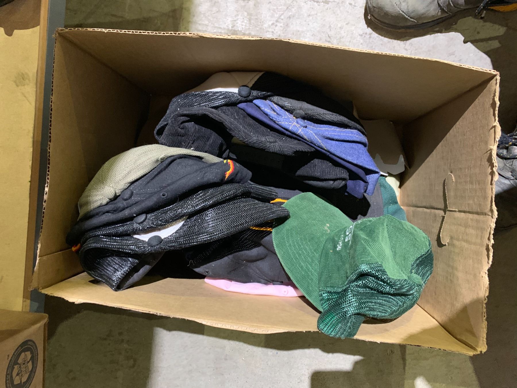 BOX OF ASSORTED HATS & BOX OF ASSORTED SHOP CLOTHING