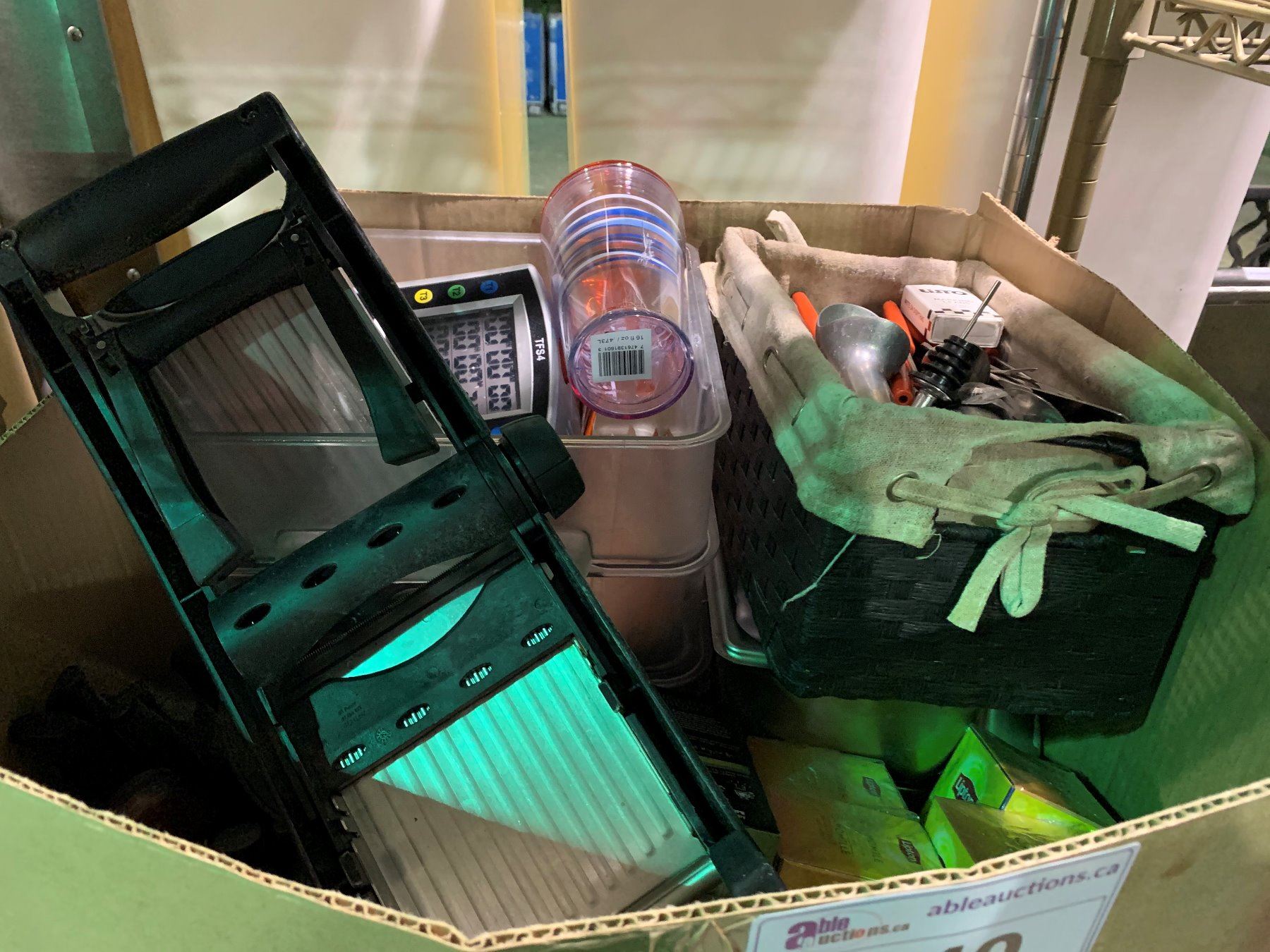 BOX OF ASSORTED KNIVES, TEAS & SCOOPS
