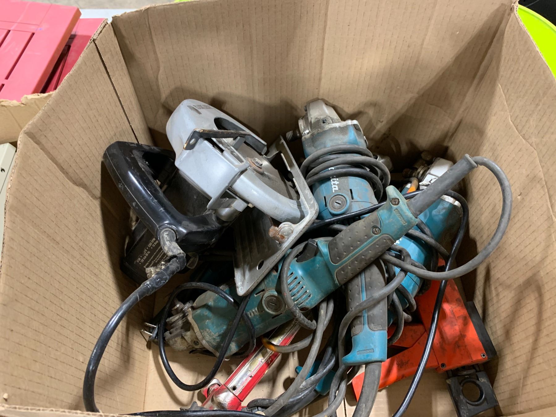 BOX OF ASSORTED MAKITA CORDED ELECTRIC GRINDERS AND BLACK&DECKER ELECTRIC CORDED CIRCULAR SAW