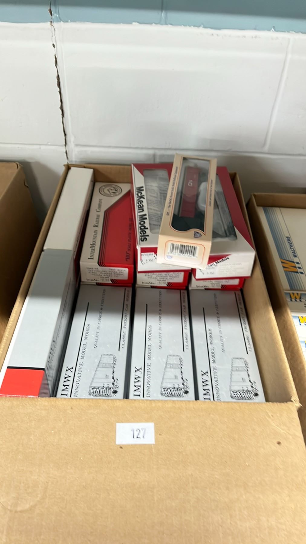 BOX OF ASSORTED MCKEAN MODELS, INTERMOUNTAIN RAILWAY COMPANY & INNOVATIVE MODEL WORKS HO SCALE MODEL TRAINS