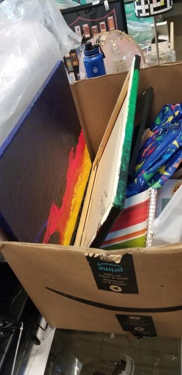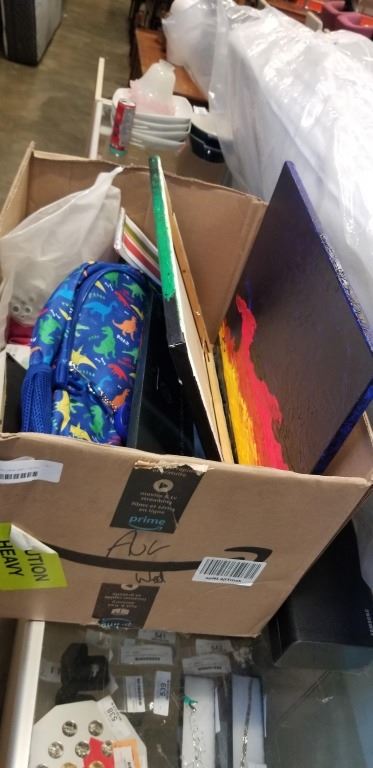 BOX OF ASSORTED NEW AND LIGHTLY USED HOUSEHOLD ITEMS, SCALE, WAFFLE MAKER, BACKPACK NEW TOWELS ETC