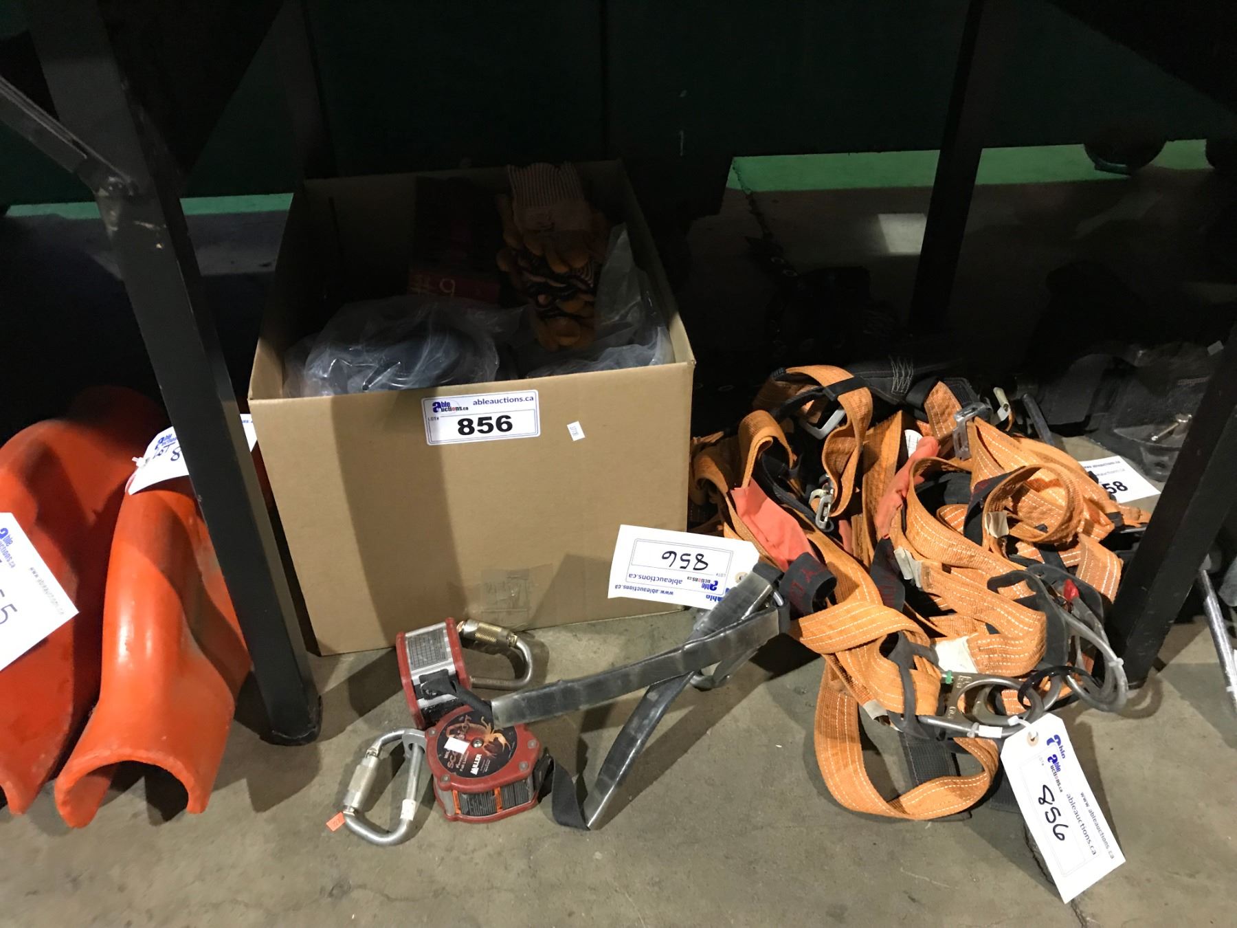 BOX OF ASSORTED SAFETY GEAR, HARNESSES & 2 MILLER SCORPION RETRACTABLE HARNESS