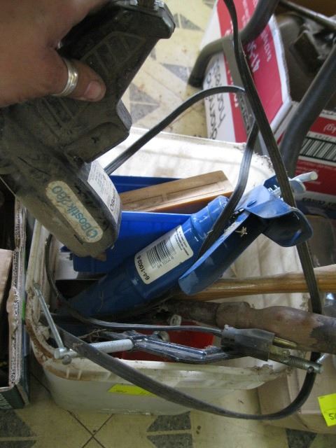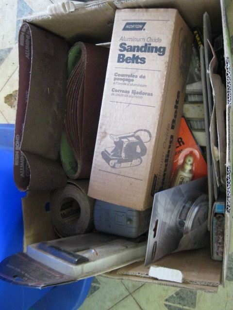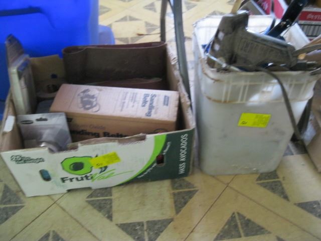 BOX OF ASSORTED SANDING PAPER & A BUCKET OF MISC. - GLUE GUN, ETC.