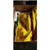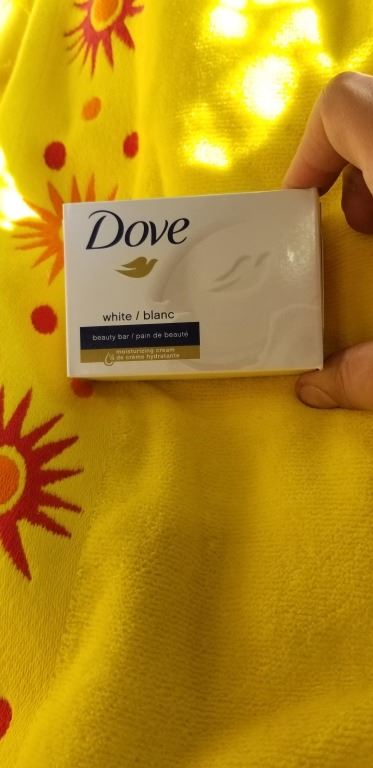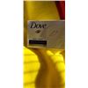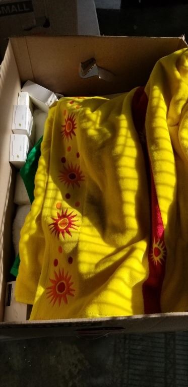 BOX OF ASSORTED TOWELS, NEW BARS OF DOE SOAP, ETC