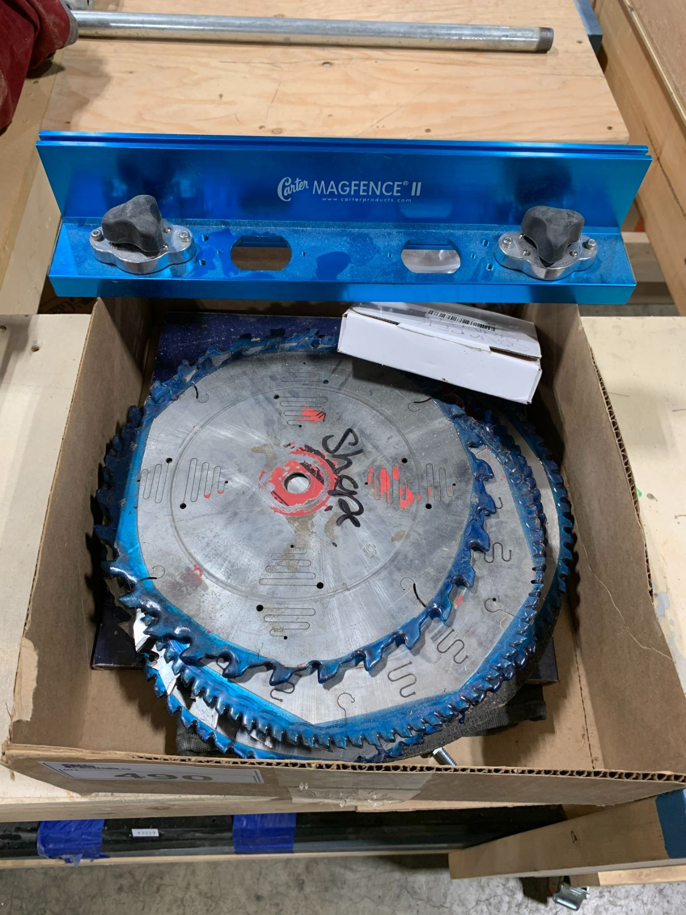 BOX OF ASSORTED WOODWORKING SAW BLADES & CARTER MAGFENCE 2 JIG