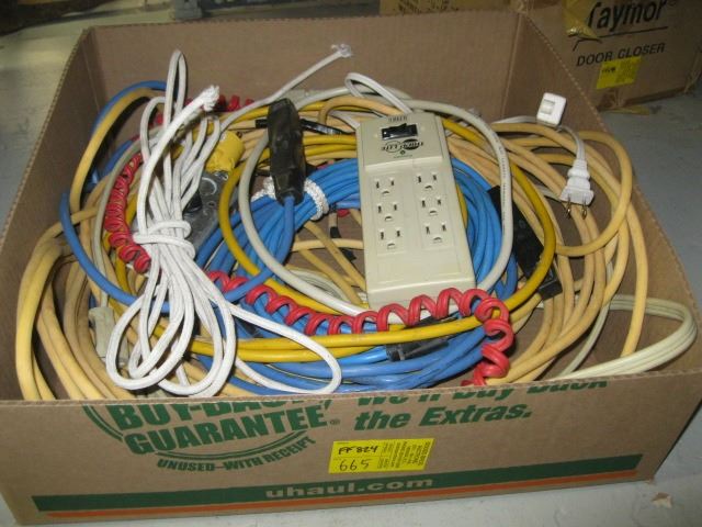 BOX OF ASST. EXTENSION CORDS, POWER BARS, ETC.