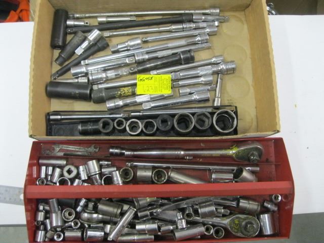 BOX OF ASST. EXTENSIONS, SOCKETS, ETC. & A TRAY WITH RATCHETS, SOCKETS, ETC.