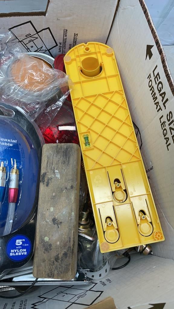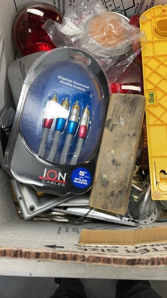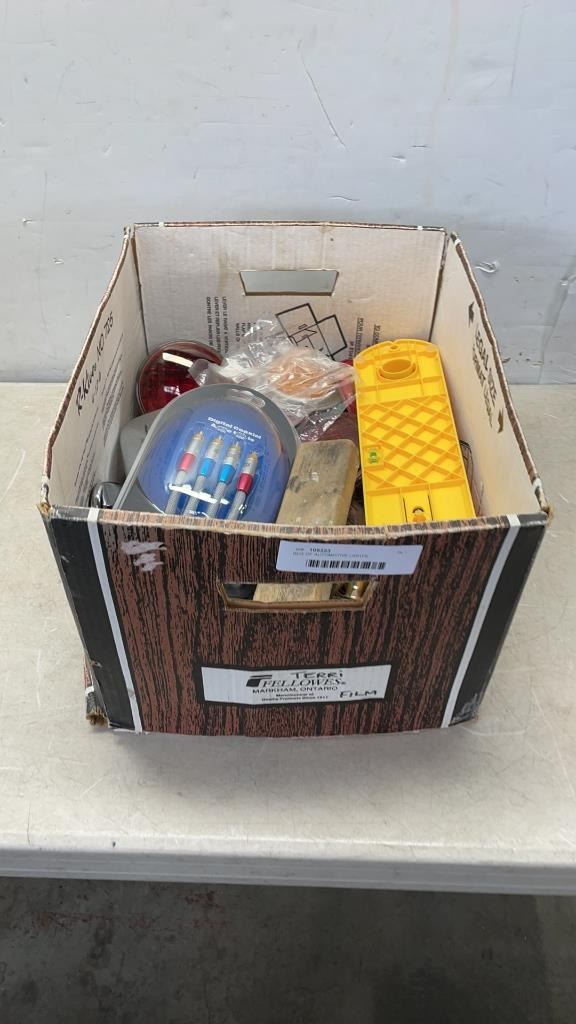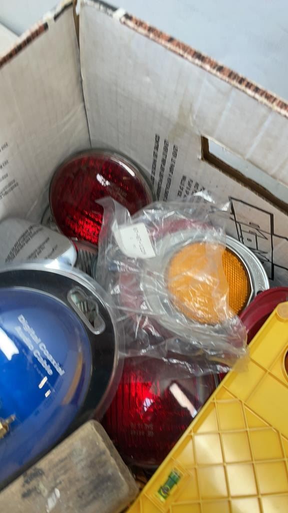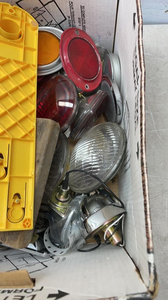 BOX OF AUTOMOTIVE LIGHTS, REFLECTORS, MIRRORS AND MORE