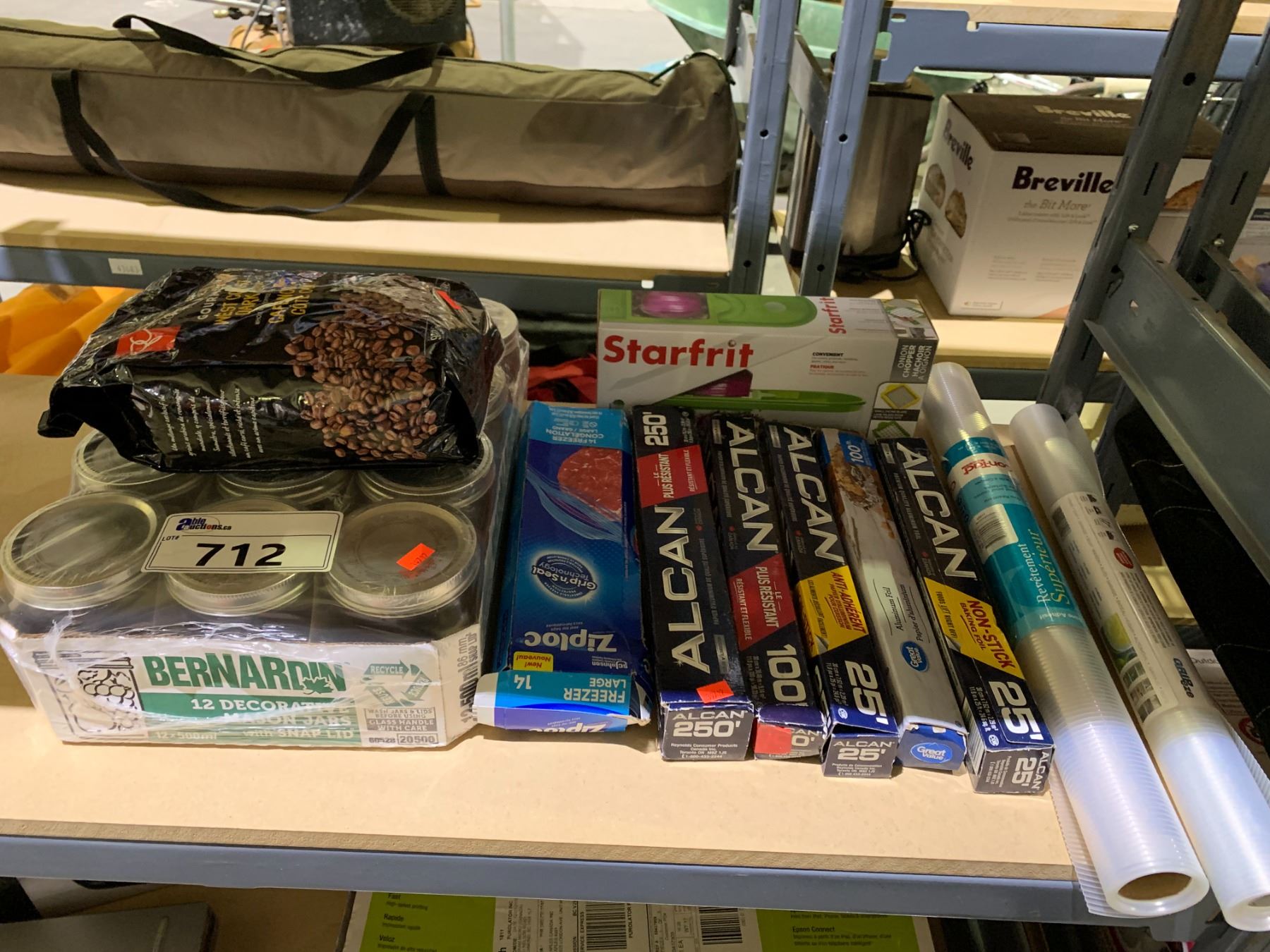BOX OF BERNARD DECORATIVE JARS, TIN FOIL, SHELF LINER AND MORE