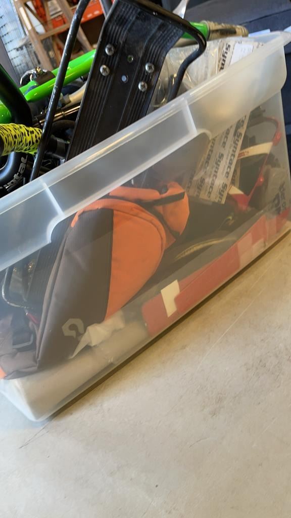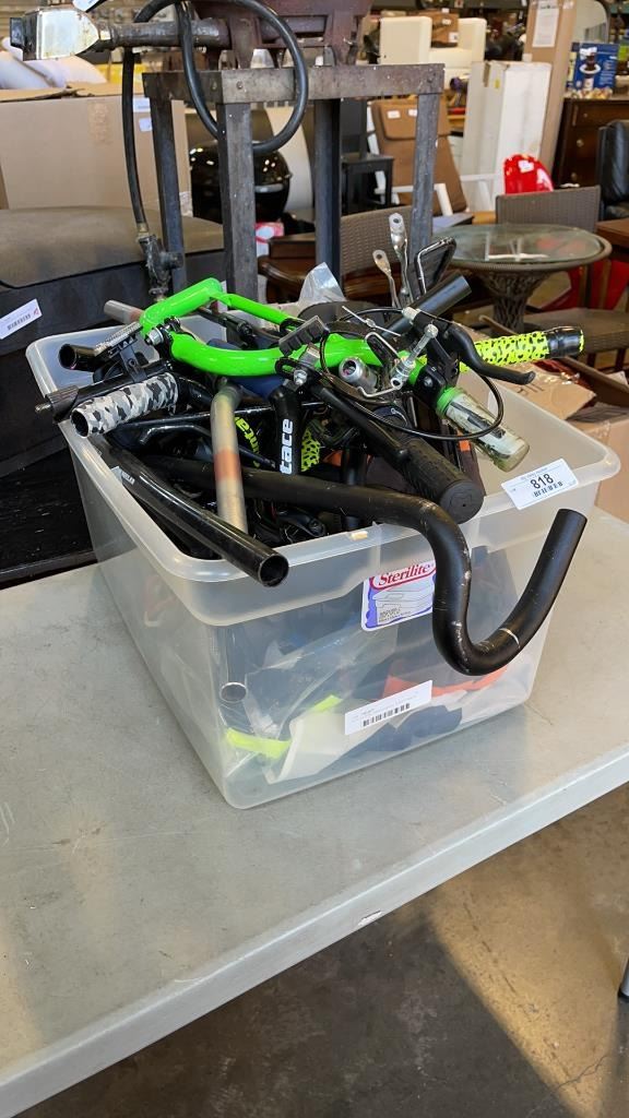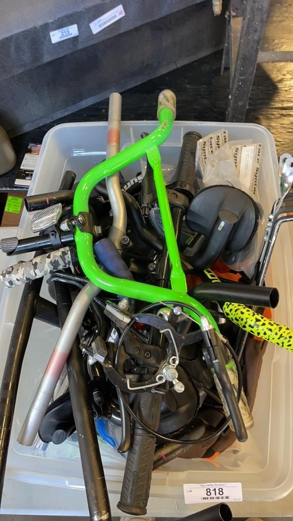 BOX OF BIKE HANDLEBARS, CARGO RACK AND MORE