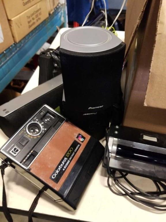 BOX OF BLACKLIGHTS, PIONEER SPEAKERS, FOLDING WALKER AND CANE