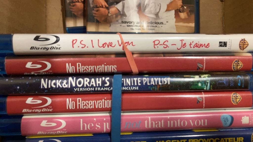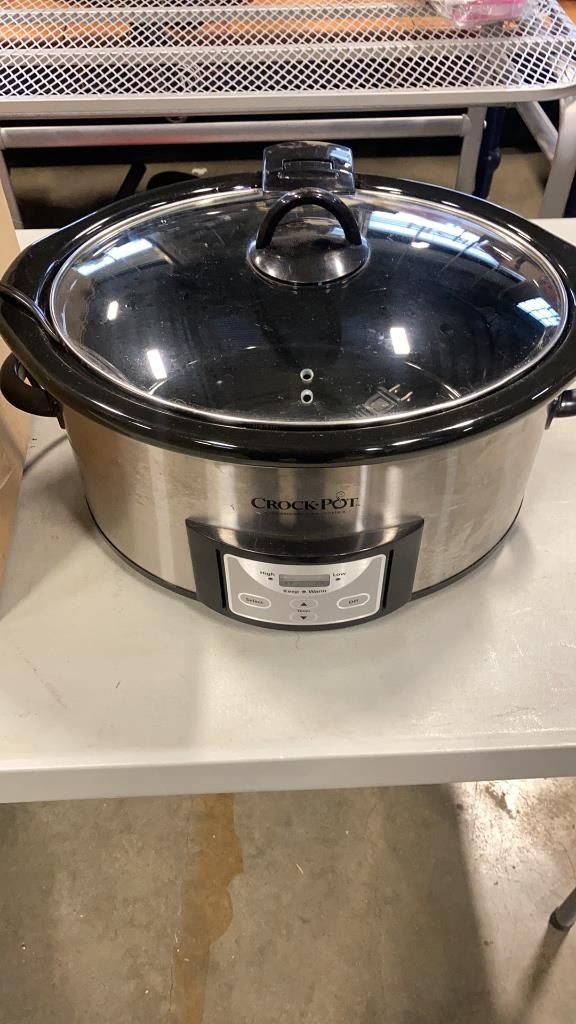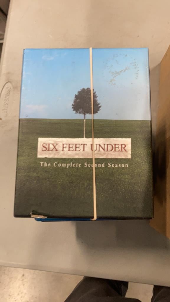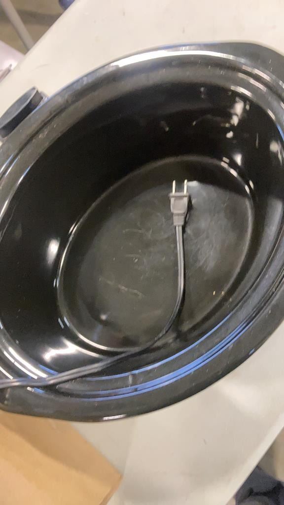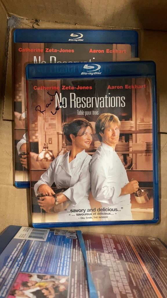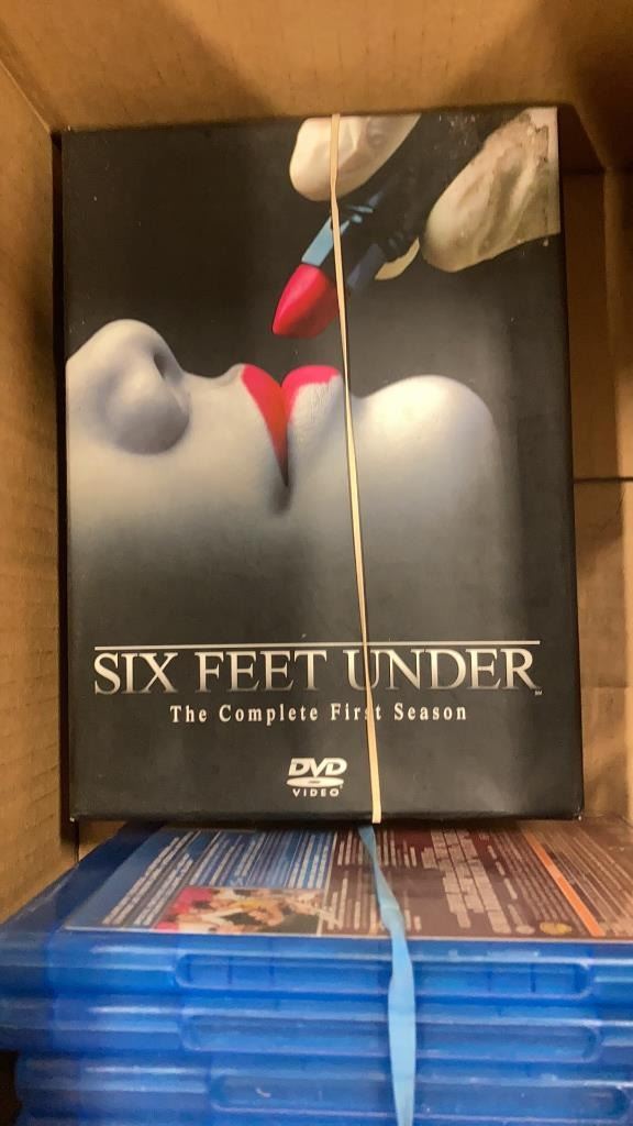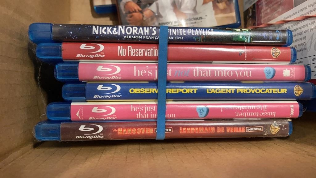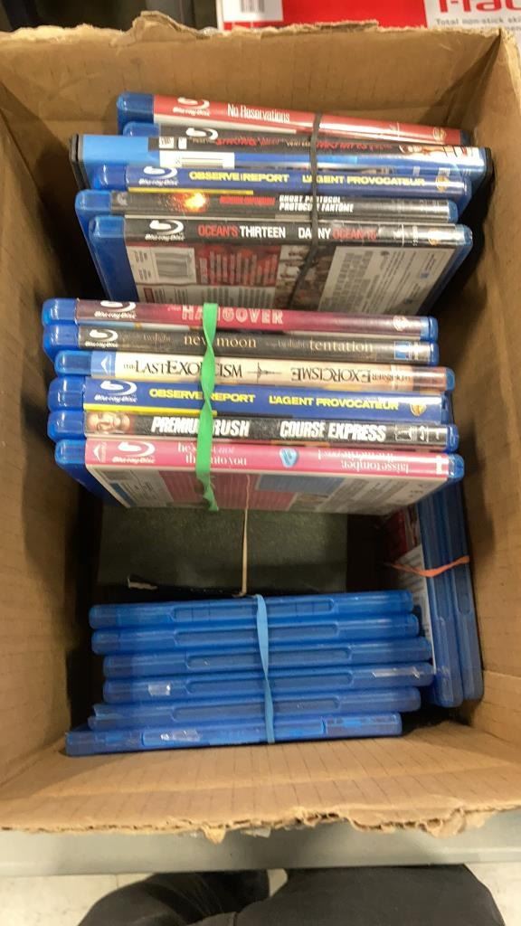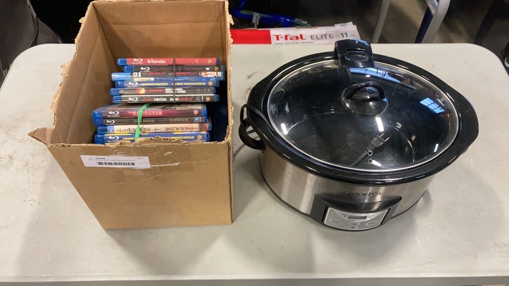 BOX OF BLU RAY DVDS AND CROCKPOT
