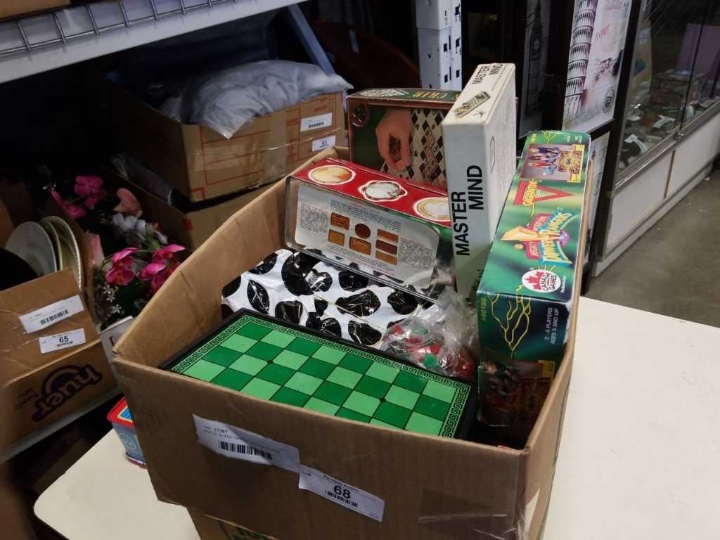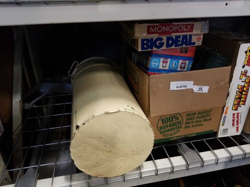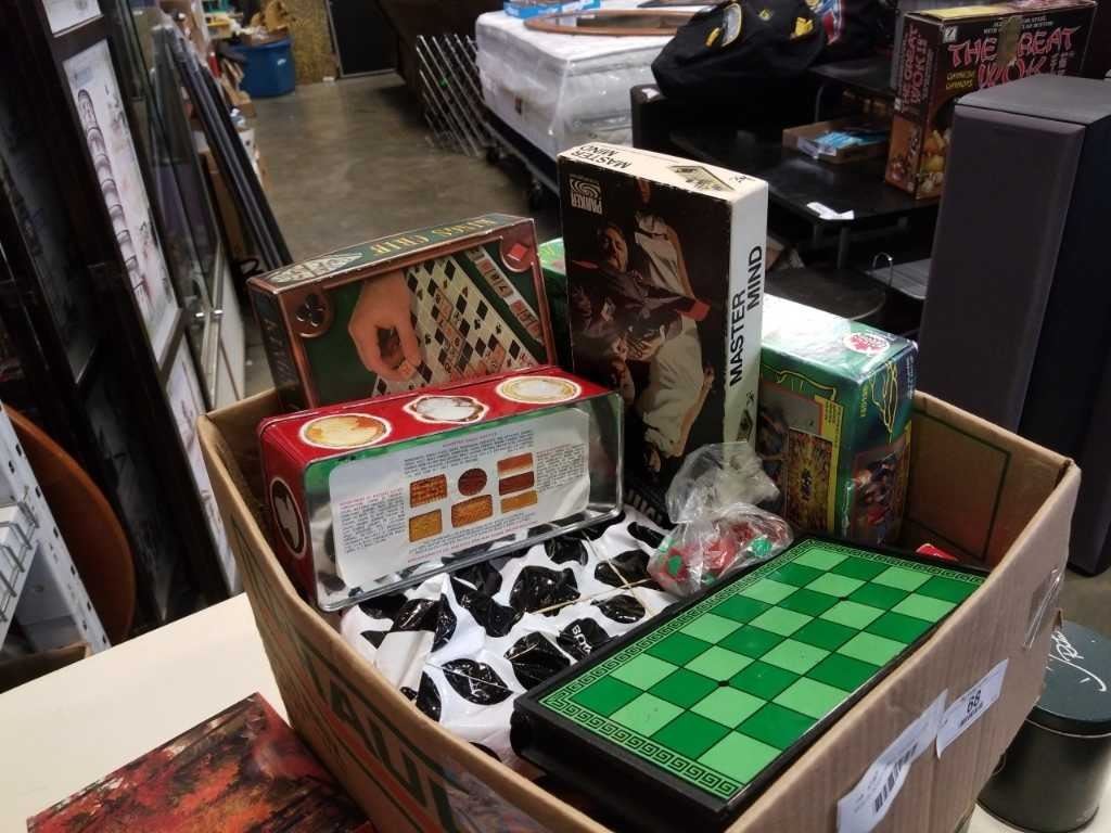 BOX OF BOARD GAMES, VINTAGE FLOUR TIN AND WICKER BASKETS