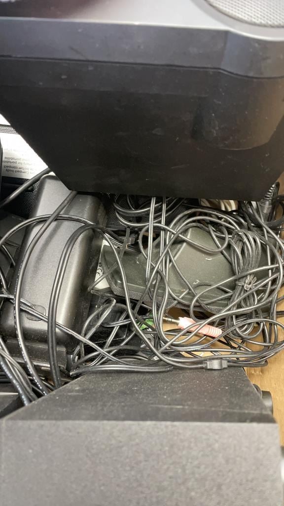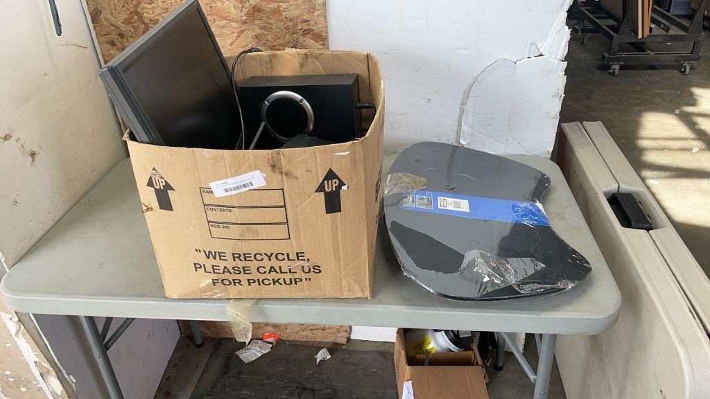 BOX OF BOSE SPEAKERS AND LAPTOP LAP TRAY