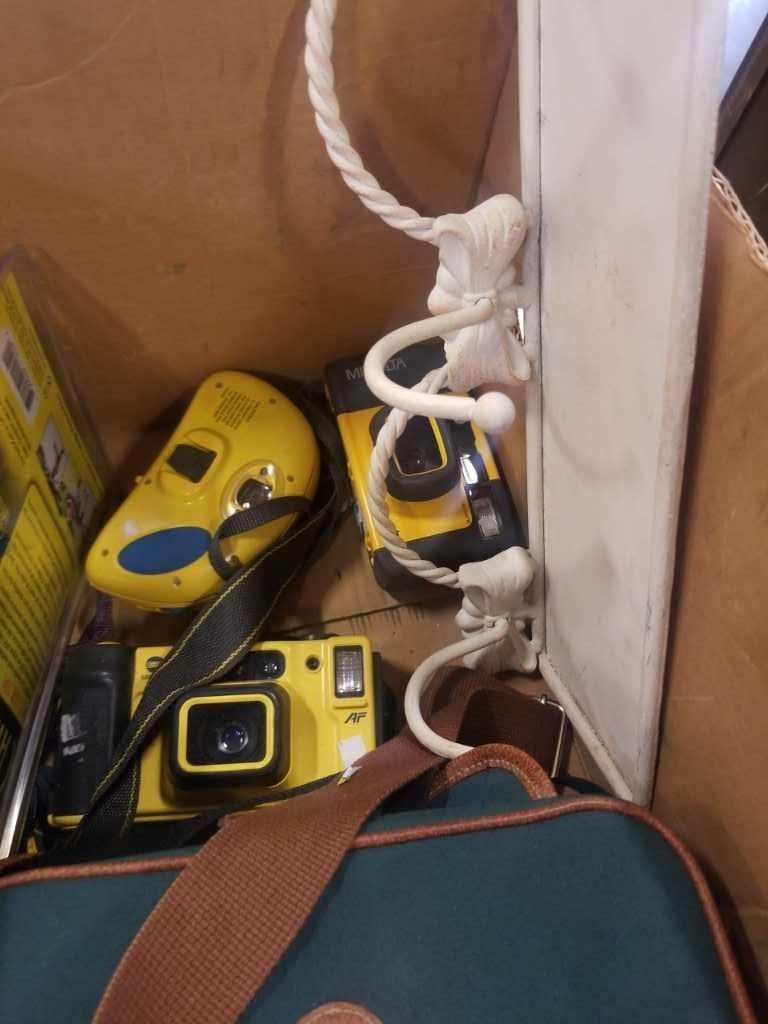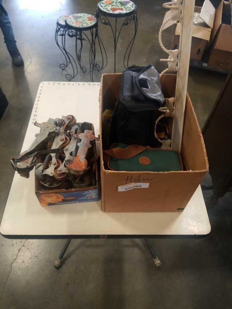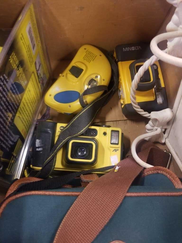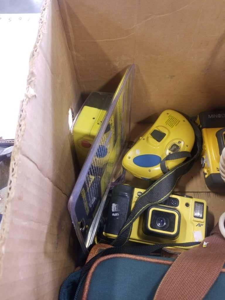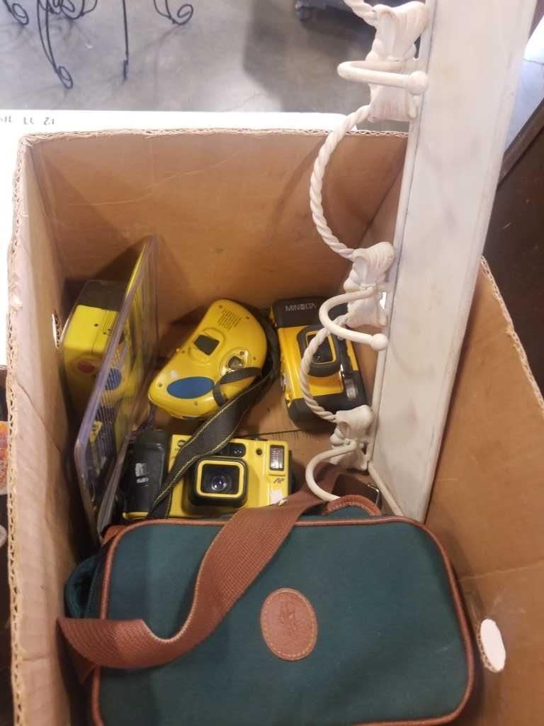 BOX OF CAMERAS, VINTAGE ROLLER SKATES