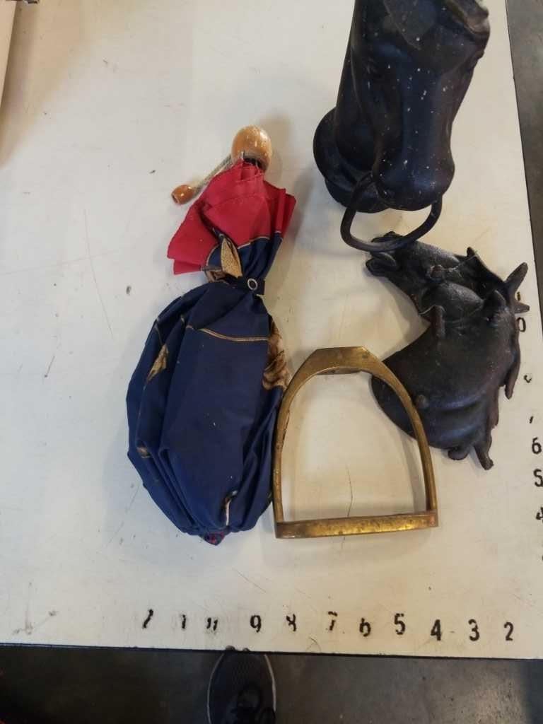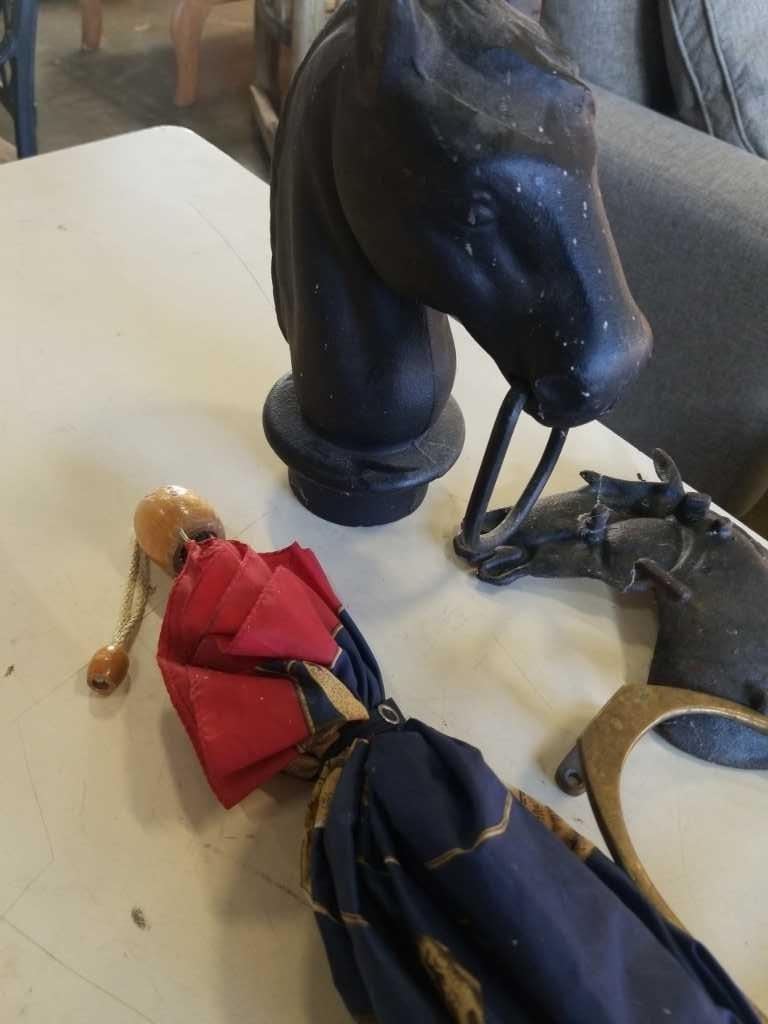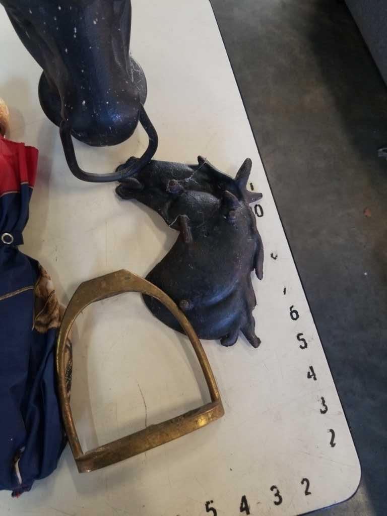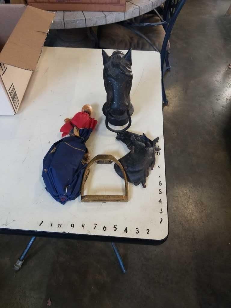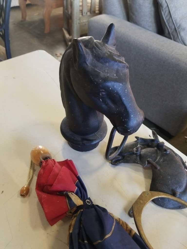 BOX OF CAST IRON HORSE HEAD, TRAY, DOOR KNOCKER AND UMBRELLA