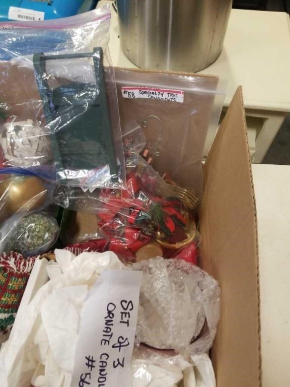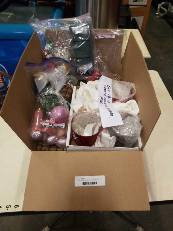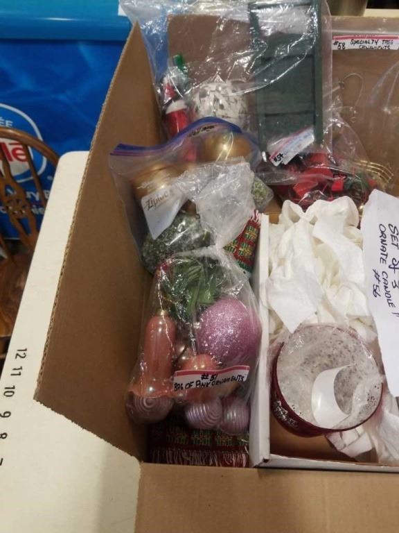 BOX OF CHRISTMAS BALL ORNAMENTS, CANDLE HOLDERS AND CHRISTMAS DECOR