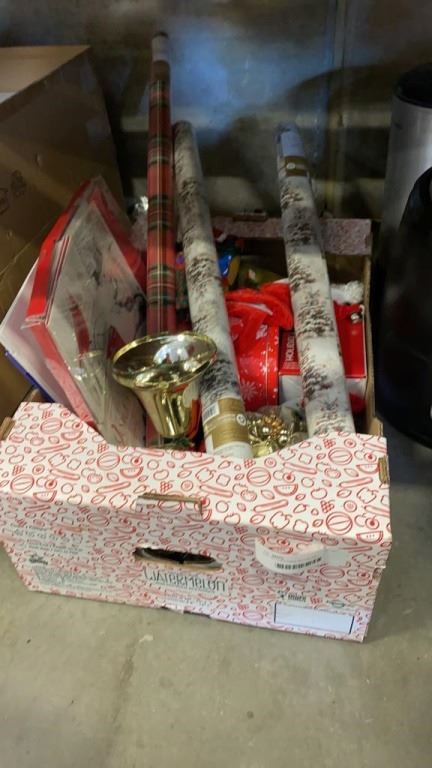 BOX OF CHRISTMAS DECOR AND WRAPPING PAPER