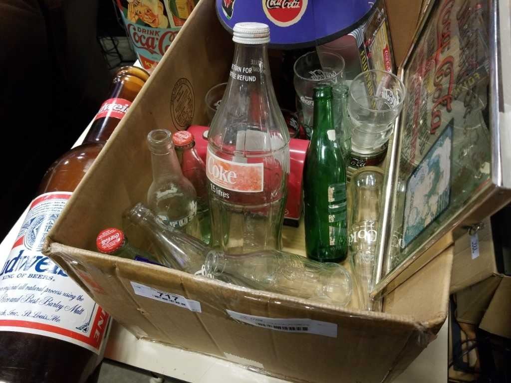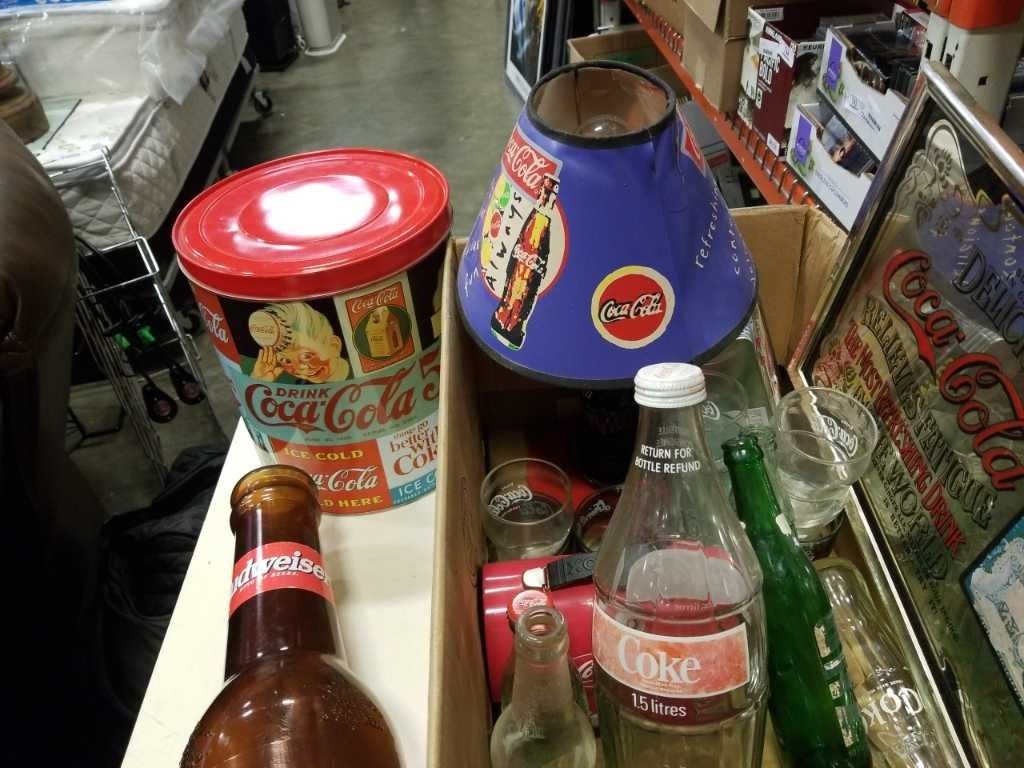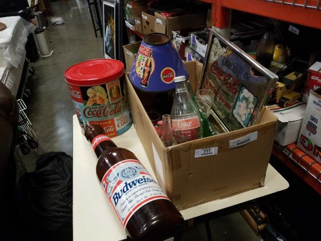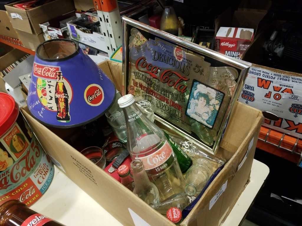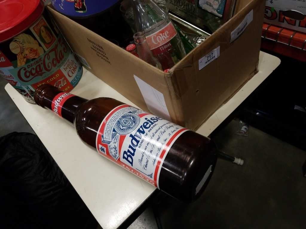 BOX OF COCA COLA COLLECTABLES, MIRRORED ADVERT, LAMP, AND LARGE BUDWEISER BOTTLE