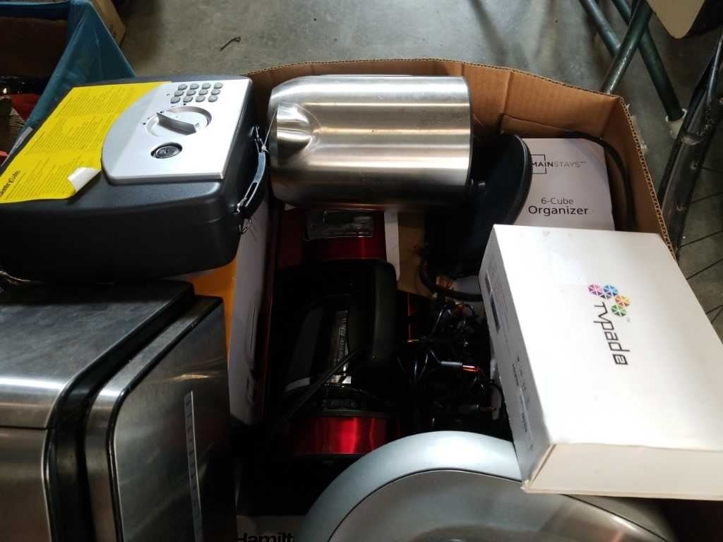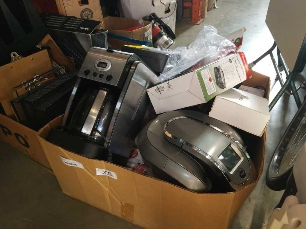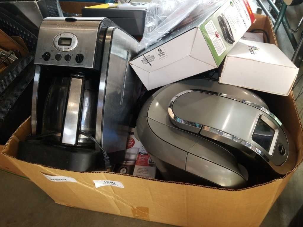 BOX OF COFFEE MAKERS, GRINDER, TVPAD2 TV BOX